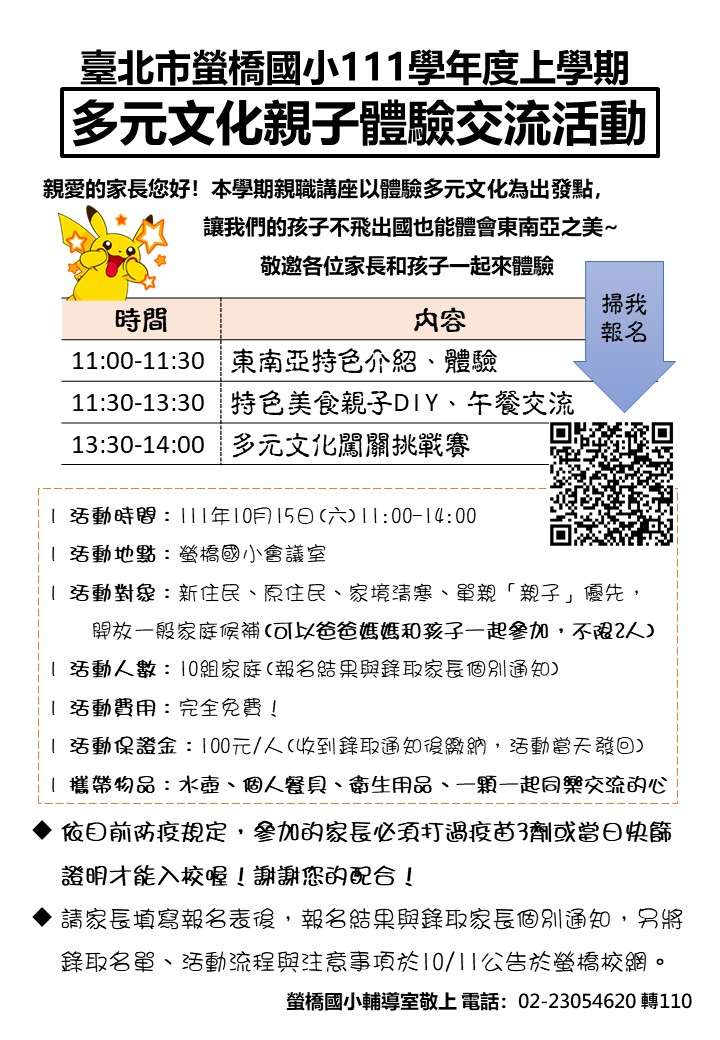 一、本校辦理多元文化親子體驗交流活動,活動免費採線上報 名,敬請協助公告於校網並周知校內弱勢學童。