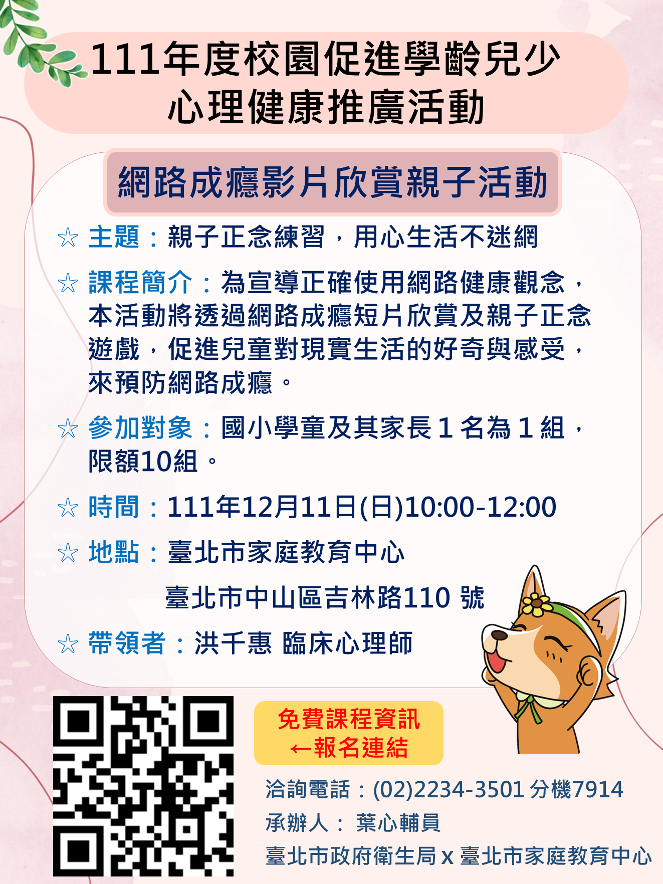 (五)報名網址:臺北市社區心理中心官網-報名專區-講座/活動。