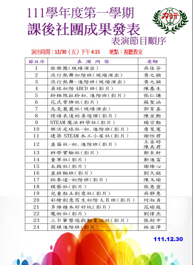 111-1課後社團成果展,將於12/30(五)下午4:15在視聽教室發表