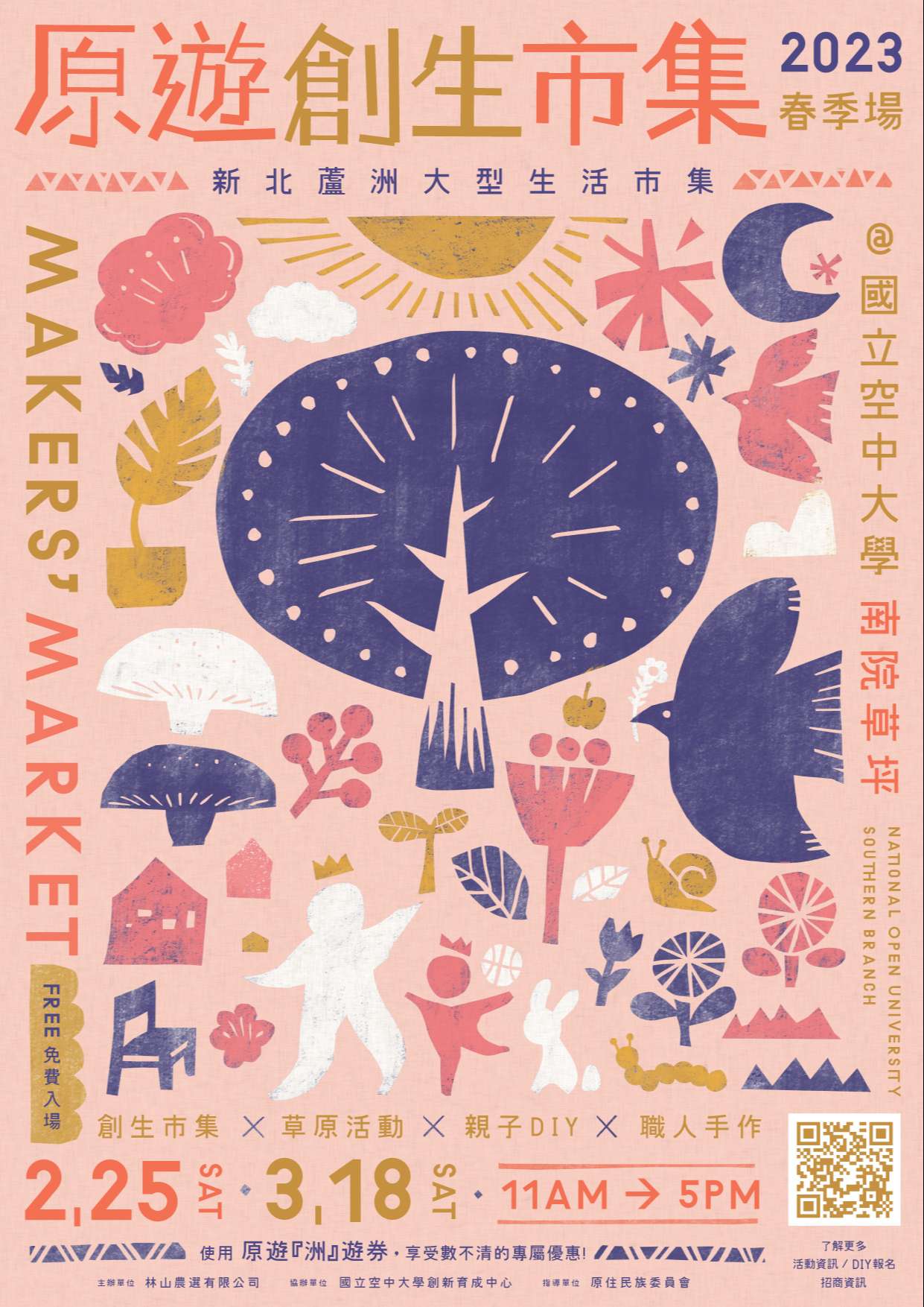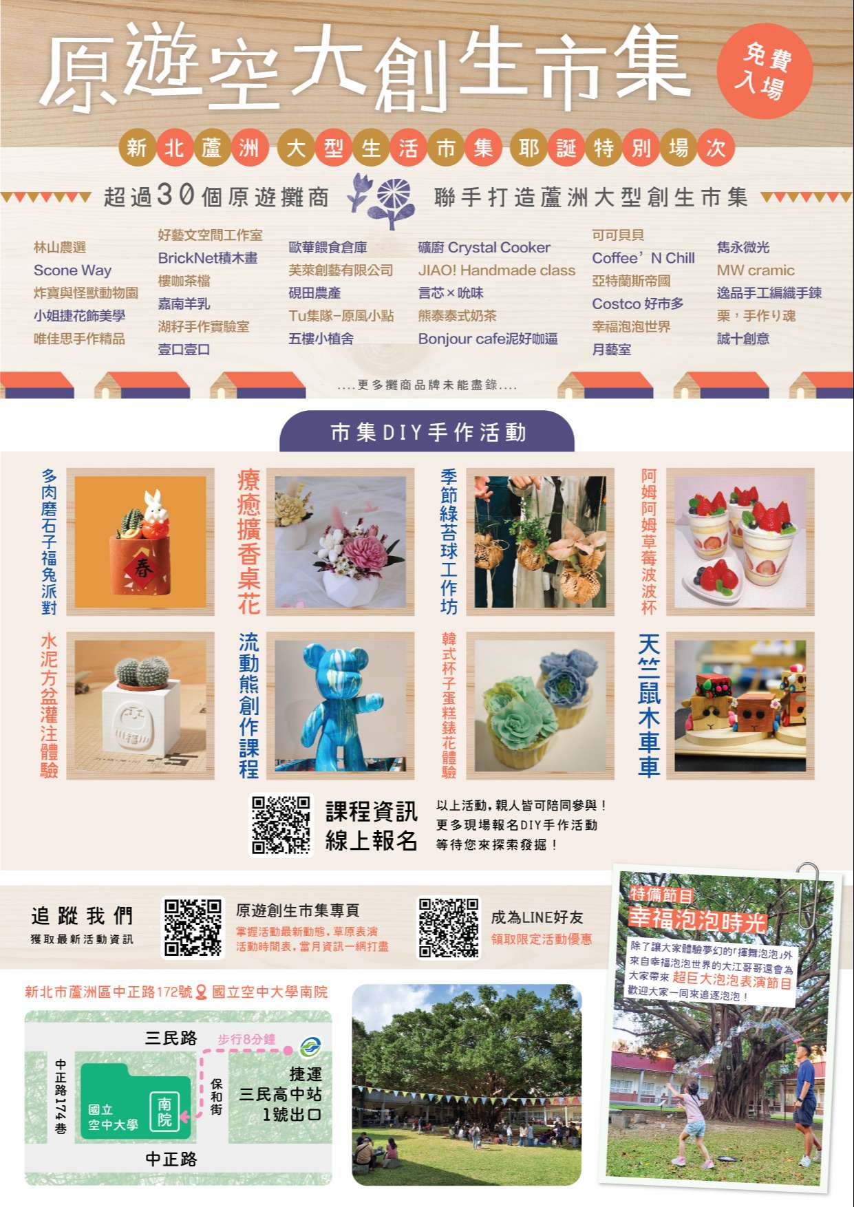 一、今年度「原遊空大.創生市集」活動將於2月25日熱烈登 場,生活市集集結超過30家地方特色攤商提供食、買、玩 及親子手作DIY等活動。本市集竭誠歡迎民眾及親子家庭前 來老榕樹下草原區野餐漫遊,一起度過美好親子假日時 光。