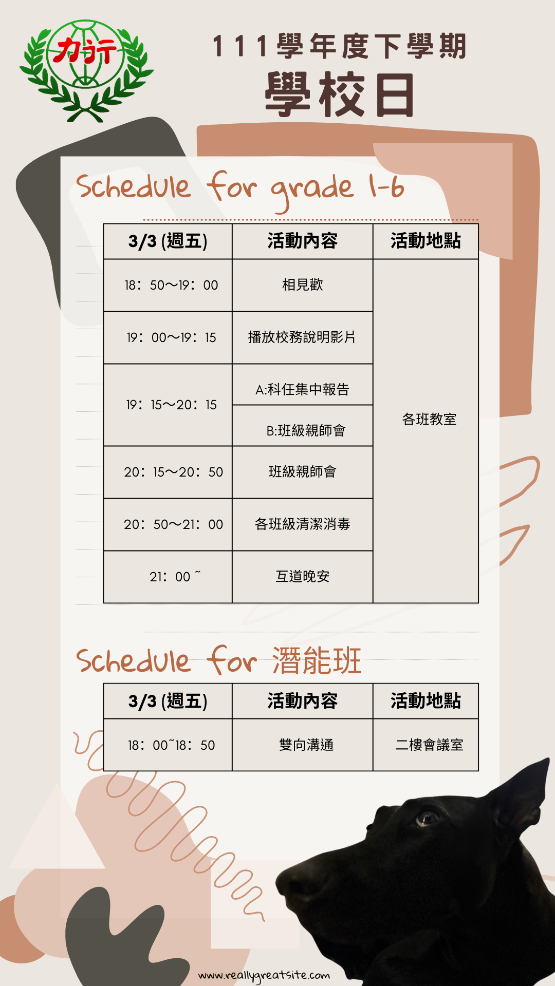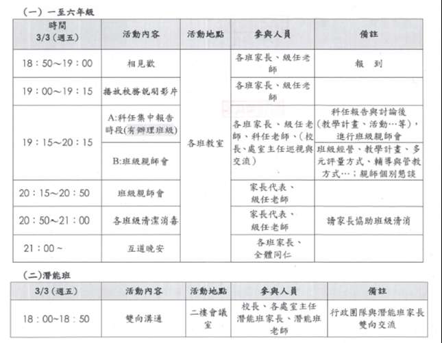 今天3/3(五)晚上舉行111-2學校日及潛能班親師座談,感謝行政團隊與老師們用心規畫準備,也積極鼓勵家長踴躍參與,考量安全與活動順利進行,總務處已公告學校日活動當晚校園不對外開放,建議小孩也不到校,配合現階段防疫措施,家長入校請配戴口罩 。111-2學校日手冊(電子檔).校長校務報告影片及共同資料將公告於學校首頁<學校日專區>,屆時再請家長參閱瀏覽,謝謝!!