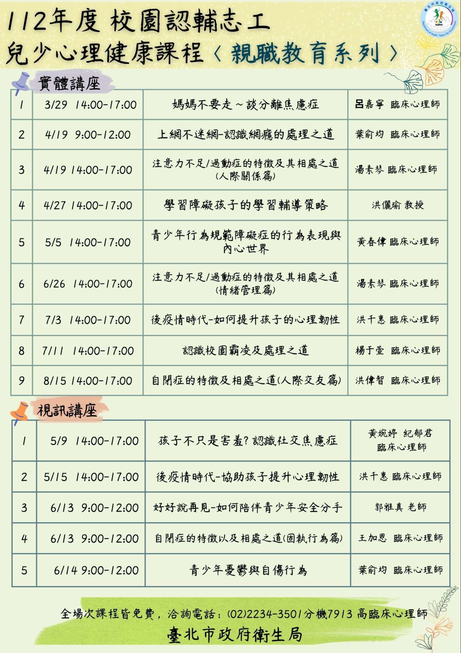 二、衛生局為增進校園認輔志工兒少相關心理衛生知能,以及 家長照顧特殊兒少之親職能力,爰辦理旨揭課程。請貴校 勵認輔志工及家長報名參加。