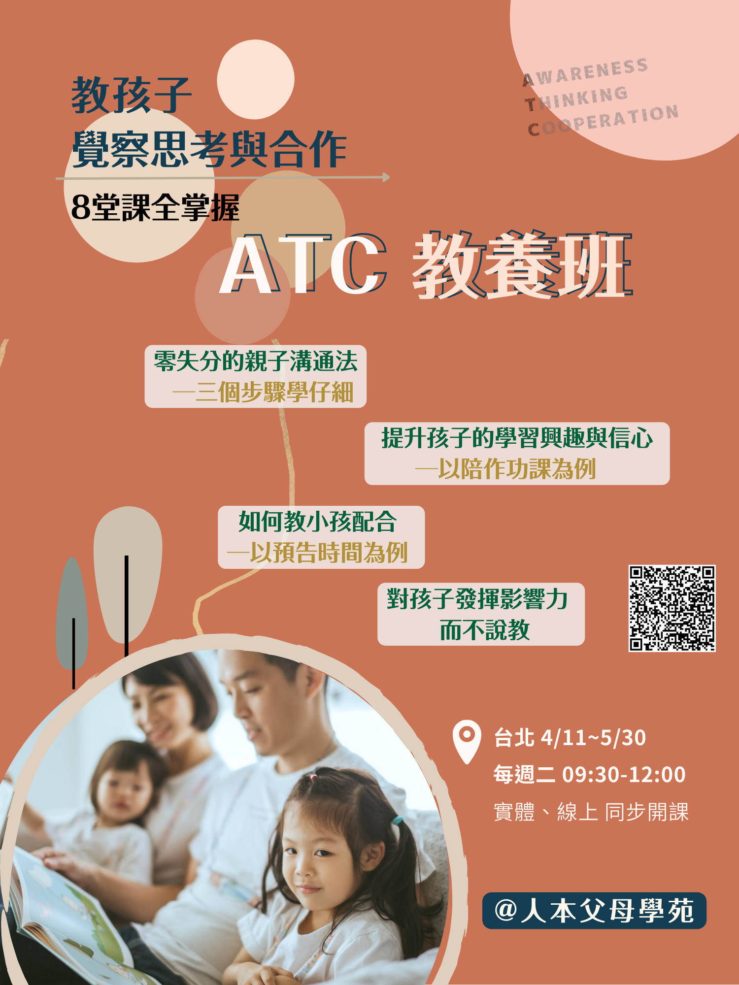 一、本會擬於112年4月11日至5月30日,舉辦「人本父母學 苑-ATC教養班」課程,包含四個講題: 1.零失分的親子溝通法~三個步驟學仔細 2.提升孩子的學習興趣與信心─以陪作功課為例 3.如何教小孩配合─以預告時間為例 4.對孩子發揮影響力而不說教