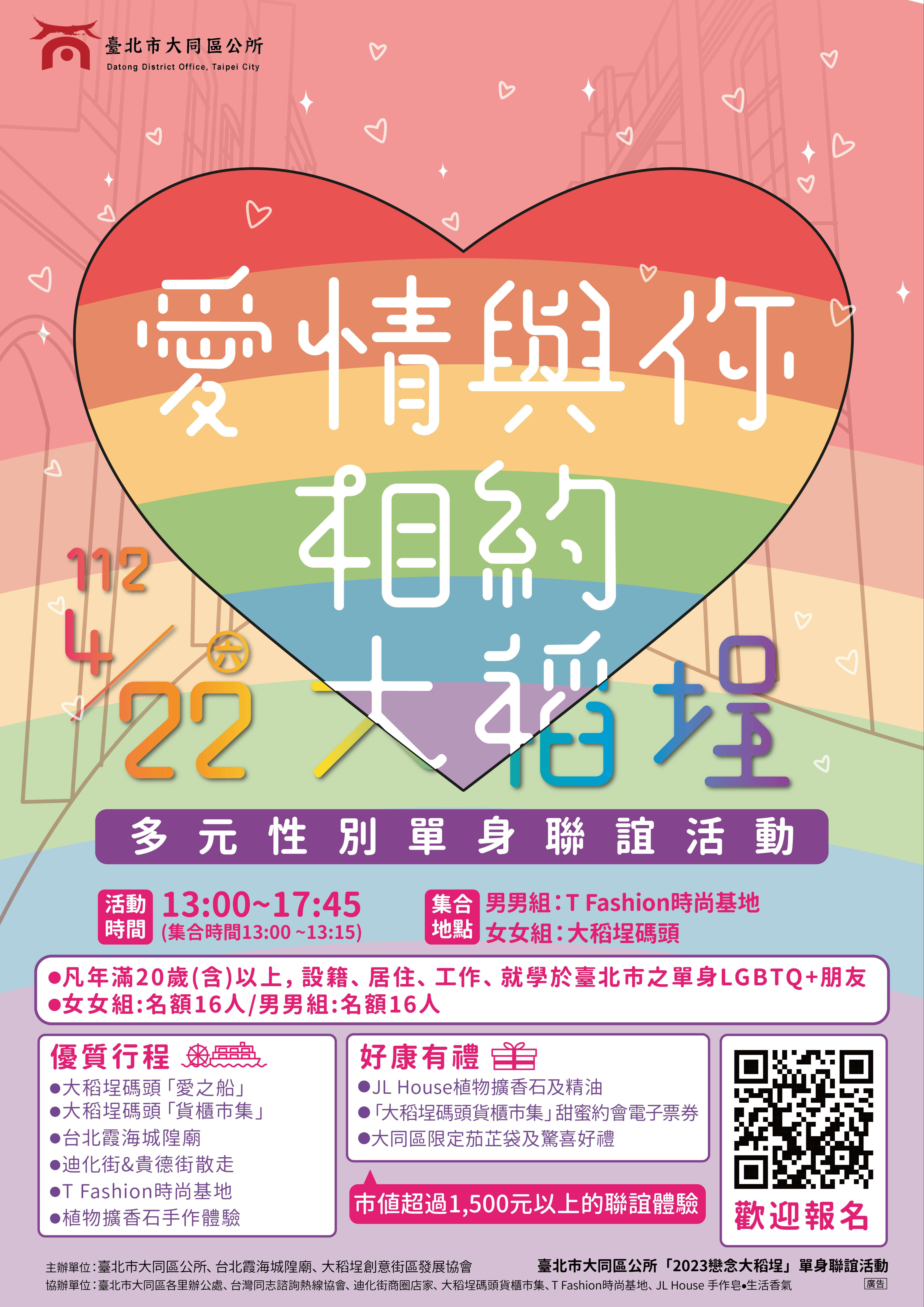 二、 臺北市大同區公所『2023戀念大稻埕』多元性別單身聯誼活動,將於112年4月22日(六)下午1時至5時45分,假迪化街商圈街區及大稻埕碼頭舉辦,凡年滿20歲(含)以上,設籍、居住、工作或就學於臺北市之單身同志朋友皆可參加,總計32個名額,男男組、女女組各16名,免參加費用、免保證金,詳情請見活動海報或線上報名網址或電洽(02)25975323轉806大同區公所古小姐。