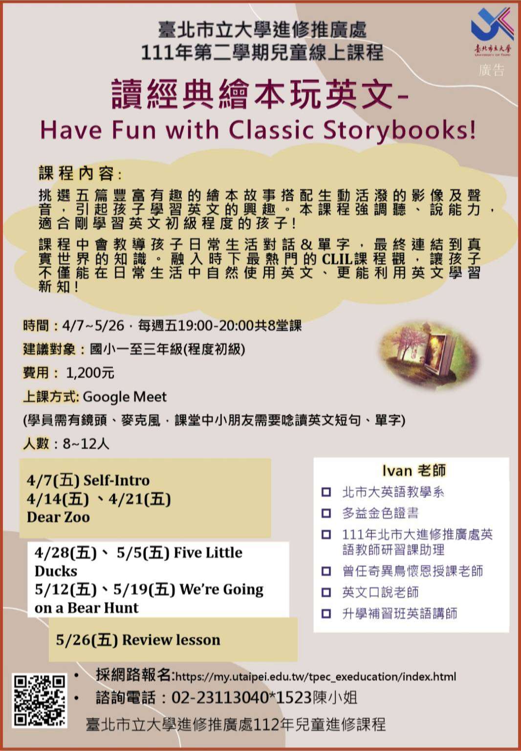 (五)網路報名:請至本處報名網頁報名網址,點選左欄: 112-春-讀經典繪本玩英文。