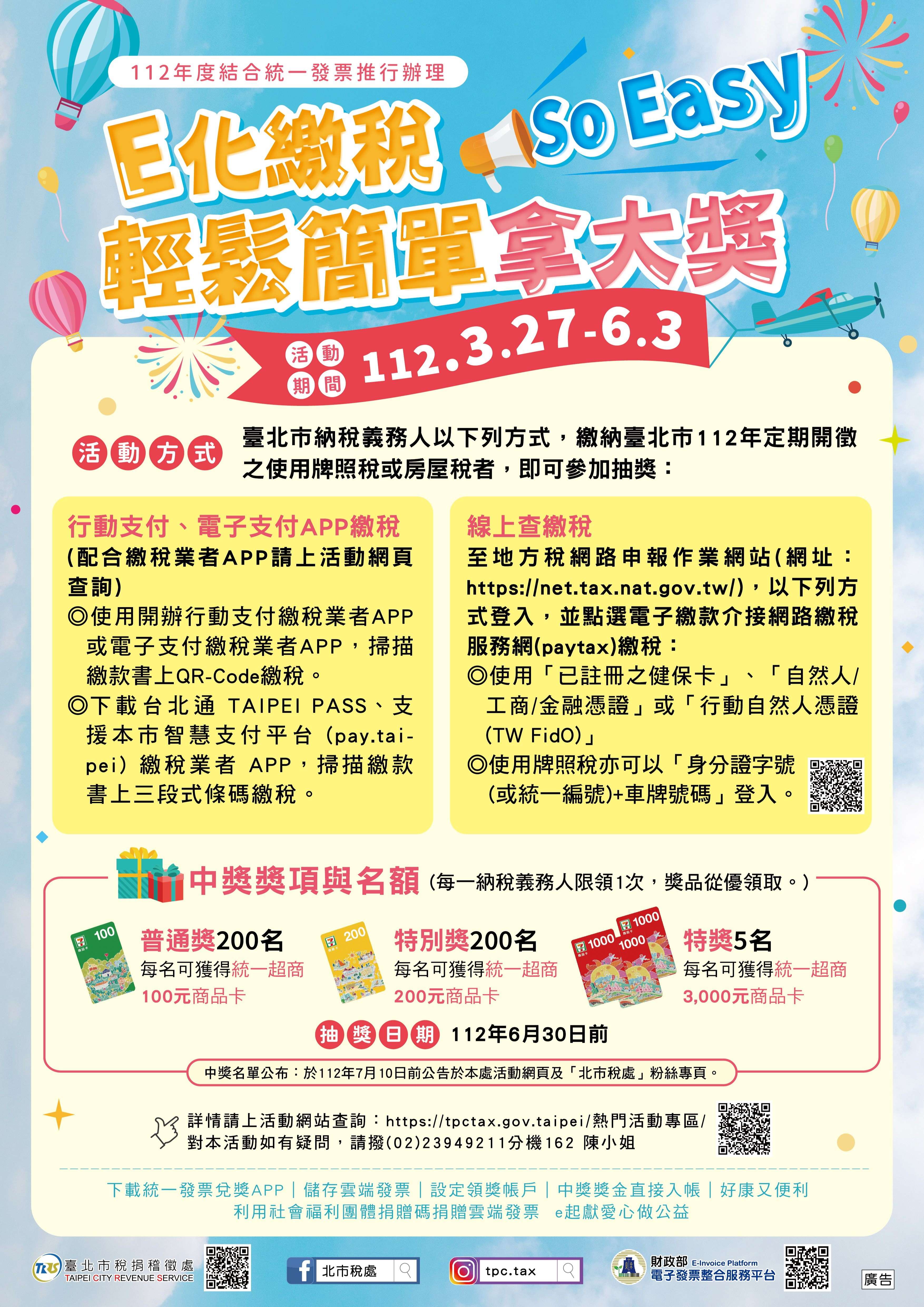 112年自用汽、機車全期及營業用車上期之使用牌照稅於112年4月1日開徵,北市稅處提醒您繳納期限至112年5月2日止,請如期繳納,以免逾期受罰。