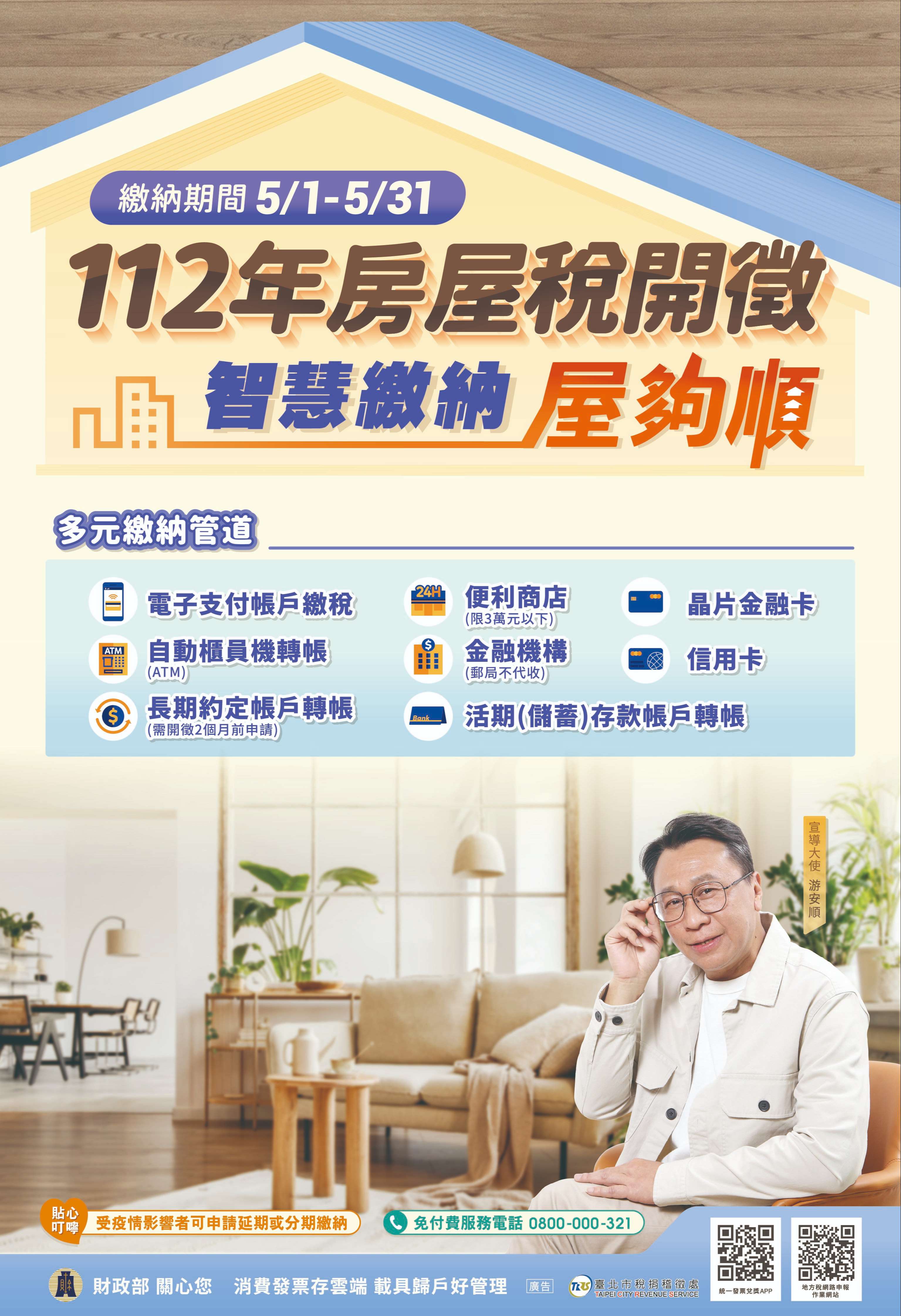 112年房屋稅於5月1日開徵,北市稅處提醒您繳納期限至5月31日止,請如期繳納。