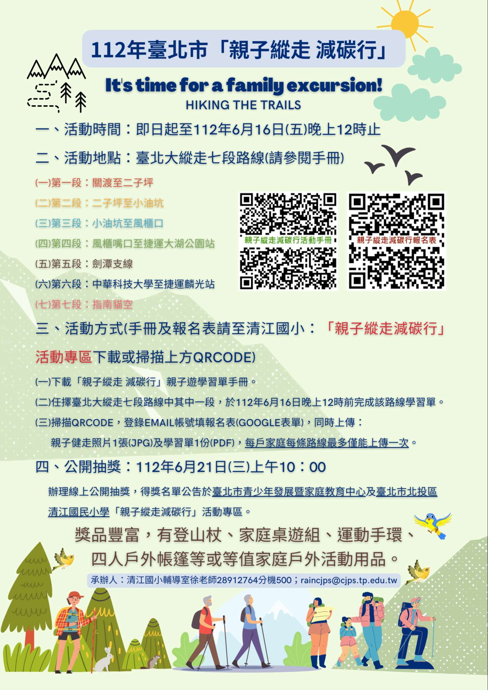 說明: 一、依據112年科學與創新教育推動計畫-「科學永續發展」行 動方案計畫辦理。 二、活動時間:即日起至112年6月16日晚上12時止。 三、活動地點:臺北大縱走七段路線(詳如附件) (一)第一段:關渡至二子坪 (二)第二段:二子坪至小油坑 (三)第三段:小油坑至風櫃嘴口 (四)第四段:風櫃嘴口至捷運大湖公園站 (五)第五段:劍潭支線 (六)第六段:中華科技大學至捷運麟光站 (七)第七段:指南貓空 四、活動方式 (一)欲參與活動者請下載「親子縱走減碳行」學習單手冊和報名表(請參考附件)。 (二)任擇臺北大縱走七段路線中其中一段,於112年6月16日 (星期五)晚上12時前完成該路線學習單,並將基本資 料、親子健走照片1張及學習單1份,拍照上傳至指定網 址即可參加抽獎。 (三)每戶家庭每條路線最多僅能上傳一次。 五、本活動訂於112年6月21日(星期三)上午10時辦理線上公 開抽獎,得獎名單公告於臺北市青少年發展暨家庭教育中 心網站及臺北市北投區清江國民小學「親子縱走減碳行」 活動專區。倘有疑義,請洽臺北市北投區清江國民小學輔 導室徐老師,電話:02-28912764轉500;Email: raincjps@cjps.tp.edu.tw。
