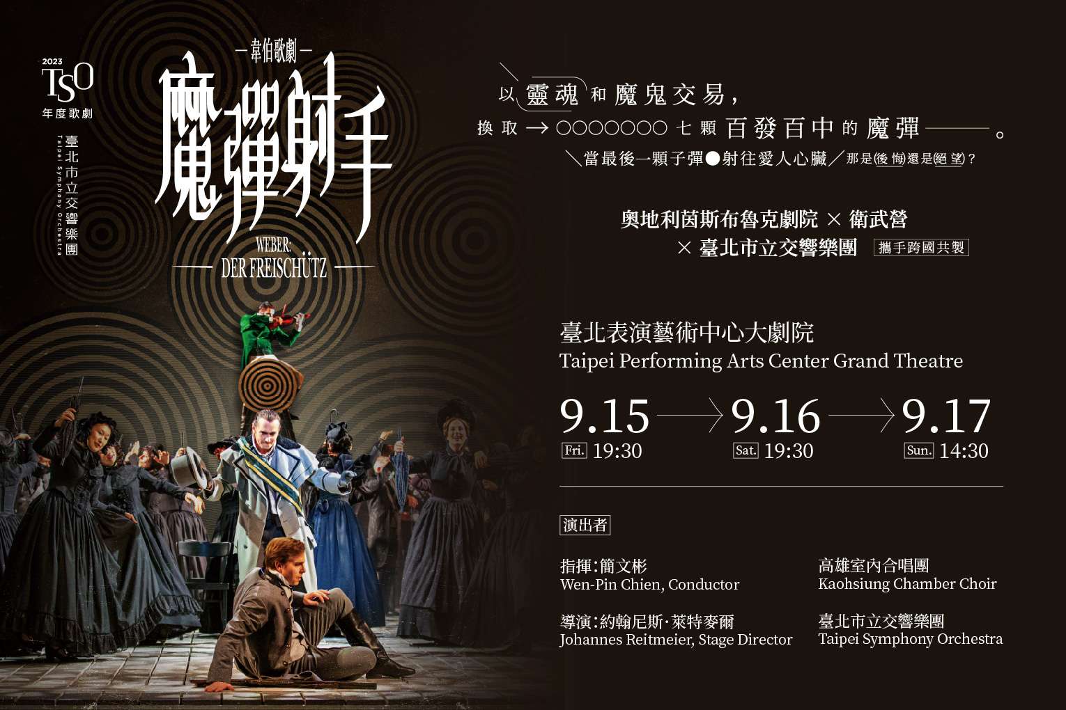 一、本團年度歌劇演出謹訂於本(112)年9月15-17日假臺北表 演藝術中心大劇院演出,帶來浪漫派歌劇經典《魔彈射 手》,由奧地利茵斯布魯克劇院、衛武營國家藝術文化中 心與本團跨國攜手合作,將於臺北及高雄兩地盛大登場!