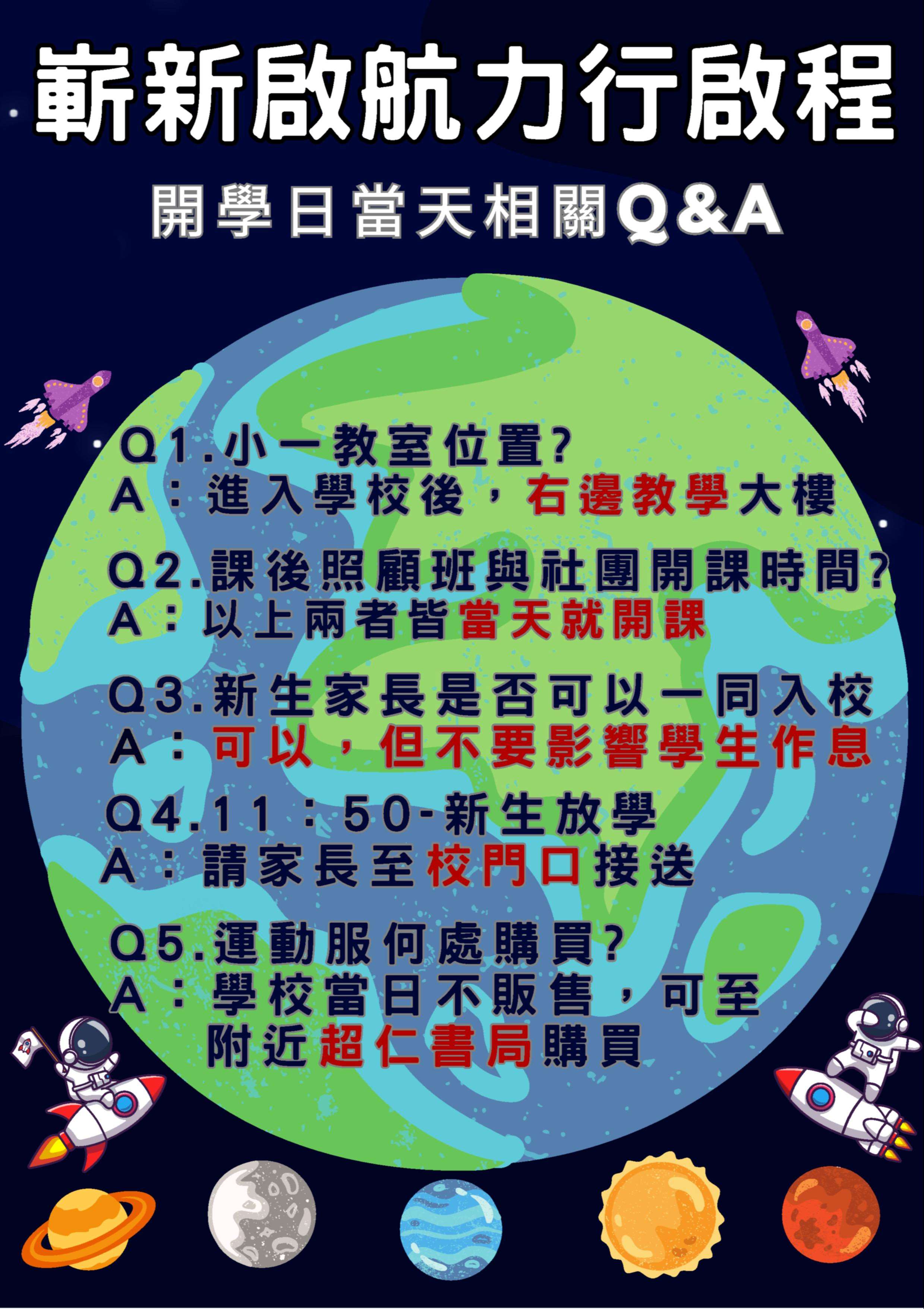 8/30(三)開學日請家長陪伴孩子上學,校長、家長會長及處室主任將於校門口前庭區歡迎小朋友上學,透過開心鼓勵與拍照合影,留下美好成長記錄。考量安全維護避免干擾及讓孩子能獨立學習,小一新生家長不陪同入班,新生於前庭各班級報到區領取名牌後,將由校內老師及志工家長協助帶領學生到勤學樓一年級各班教室,級任老師會在教室迎接孩子。