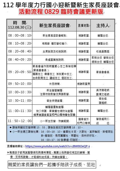 三、8/30(三)上午08:10-11:30「新生家長座談會」於視聽教室採實體會議方式進行(直播連結網址: https://youtube.com/live/cBW0tOeQP-s?feature=share)。引導新生家長了解學校狀況,並協助建立適當親職教育理念,凝聚學校與家長的共識,援例辦理「新生家長座談會」,邀請新生家長共同參與,以期攜手為孩子創造光明的未來。