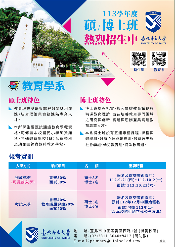 一、臺北市立大學為全臺第一所高等教育學府,教育學系承接師資培育與學術研究百年基業。碩士班招生8名;博士班設有五組專精課程:課程與教學組、教育哲史與社會學組、教育心理與輔導組、幼兒教育組與特殊教育組,合計招生7名。