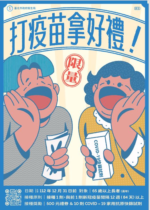 三、考量長者為感染COVID-19易產生嚴重併發症之高風險群, 且歲末年初民眾旅遊、返鄉探親等活動頻繁,疾管署預估 疫情於112年底至113年初達高峰,為提升民眾免疫保護力 及鼓勵長者儘速接種疫苗,凡65歲以上長者(滿年)獎勵 方案調整為「於112年12月31日前完成接種XBB疫苗,均可獲得500元(含)以下衛教品及10劑COVID-19家用抗原快篩 試劑」。