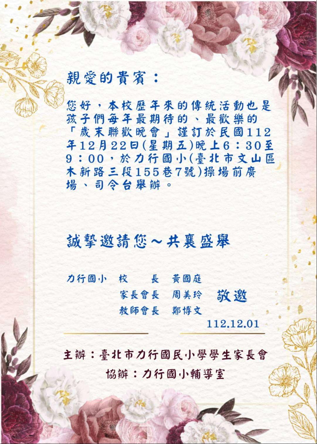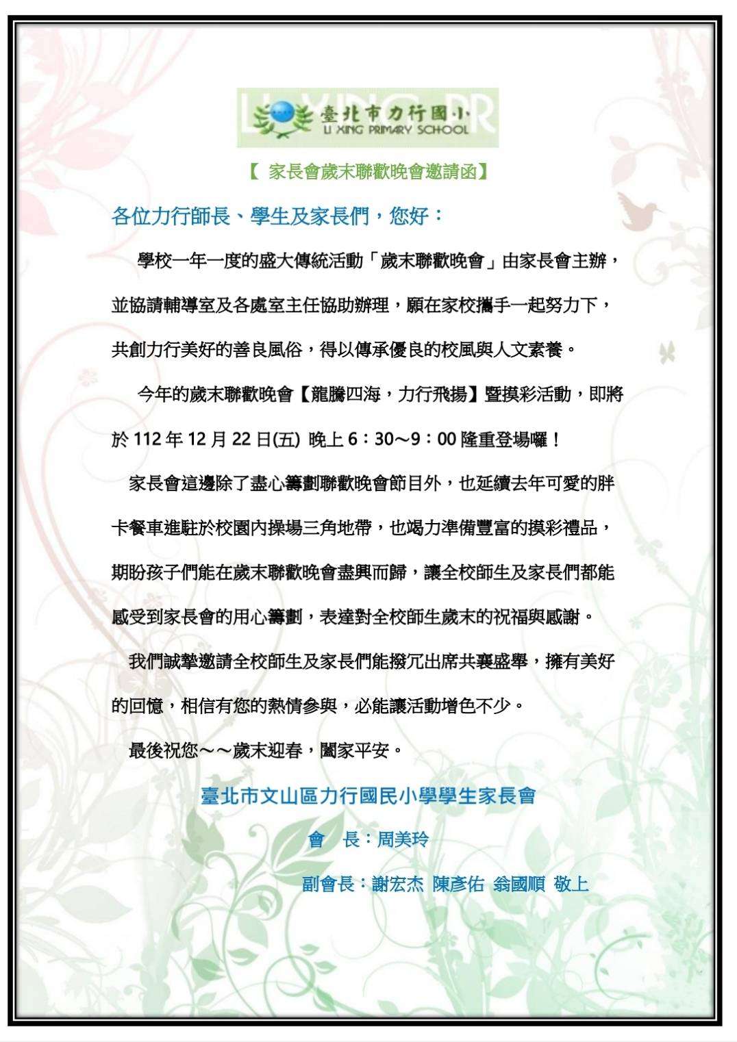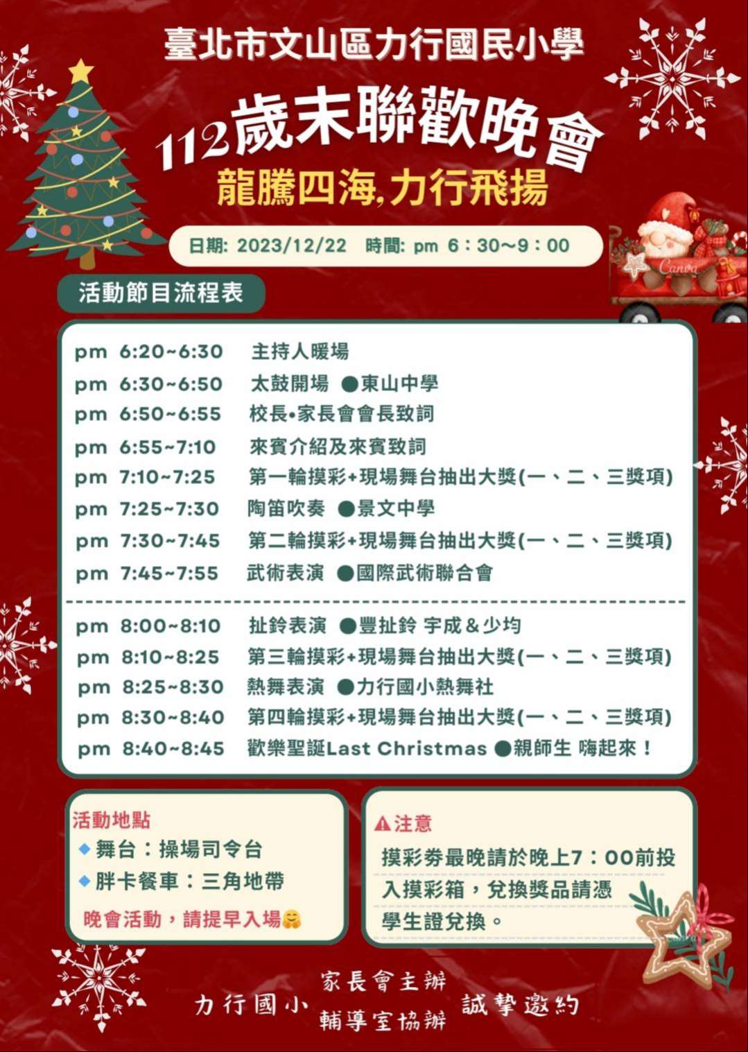 預告12/22(五)晚上【龍騰四海. 力行飛揚】家長會歲末聯歡晚會活動,邀請全校親.師.生共同歡樂參與,敬請期待中!!
