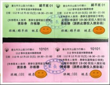 本校老師、學生每人1張蓋有家長會章的券,限本人活動當日使用,晚上7:00前投入摸彩箱,逾期無效遺失亦不補發。