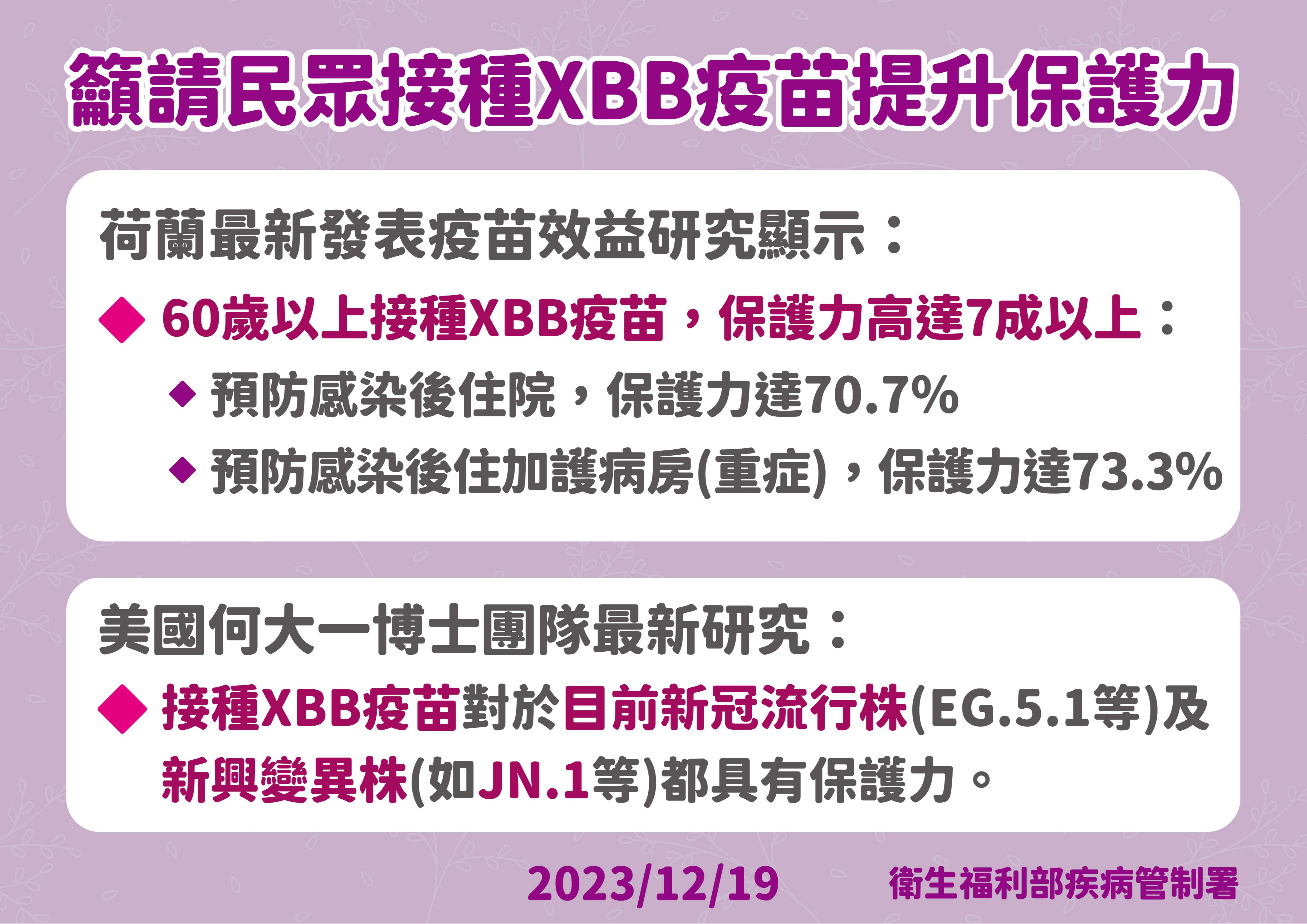 二、國內自112年10月11日起開放出生滿6個月以上民眾均可接 種新冠XBB疫苗,依據臨床研究數據顯示,新冠XBB疫苗對 於現流行之變異株及JN.1等新興變異株均有保護力,接種 疫苗可提升免疫保護力,降低染疫後重症及死亡風險。