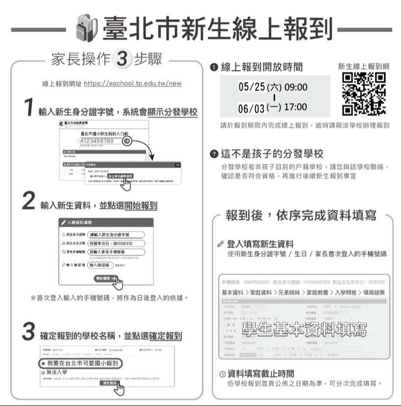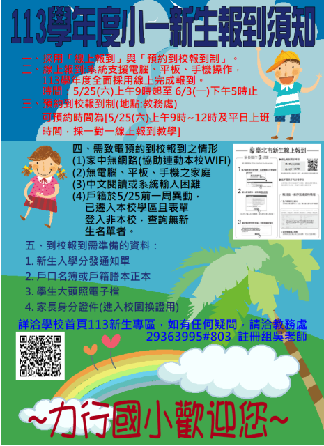 歡迎您的貴子弟加入力行國小就讀,臺北市小一新生將於5/25(六)-6/3(一)各校辦理新生入學線上報到