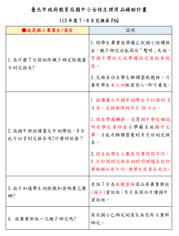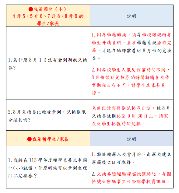 轉知台北市112學年度國小畢業生及113學年度國中新生領取113年7、8月份生理用品兌換券,轉知學生及家長,請留意學生學籍建置期程。