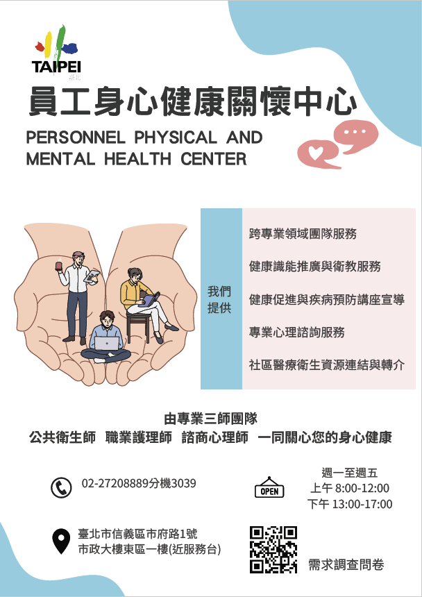 五、檢附臺北市政府員工身心健康關懷需求問卷供參(如附件1);旨揭需求問卷調查QRcode(如附件2),可連結至問卷內容;員工身心健康關懷服務中心宣導海報(如附件3)