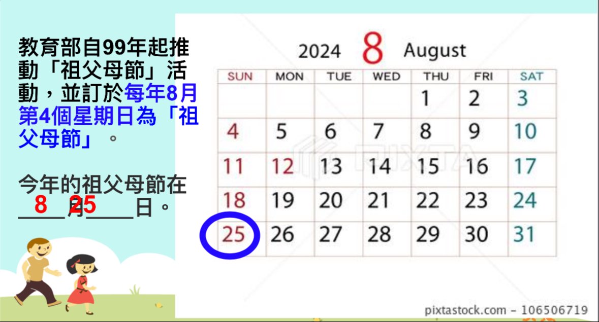 教育部自99年起推動「祖父母節」活動,並訂於每年8月第4個星期日為「祖父母節」。