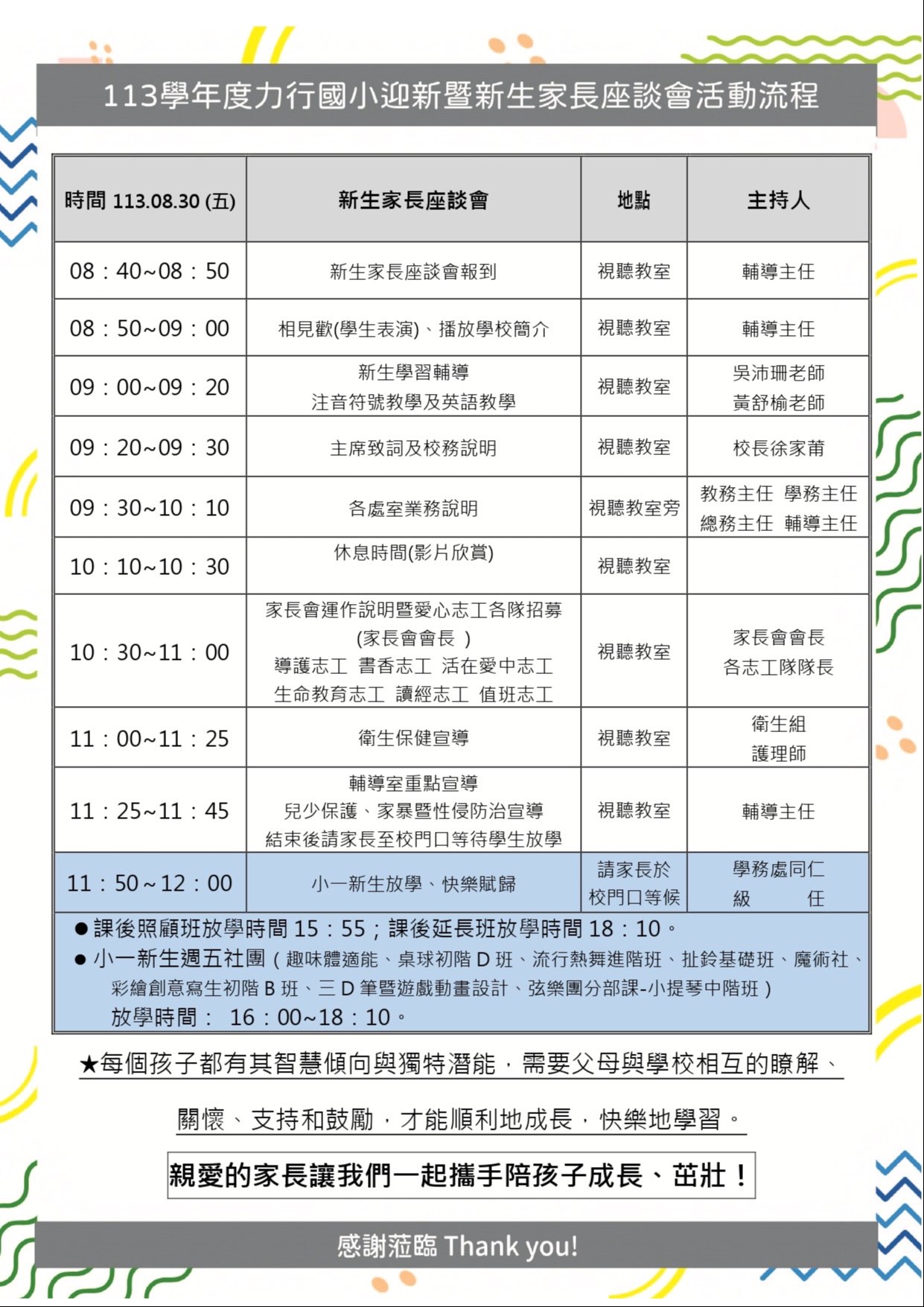 暑假結束,8/30(五)要開學囉! 一起歡喜迎接113學年度開學日暨新生家長座談會~