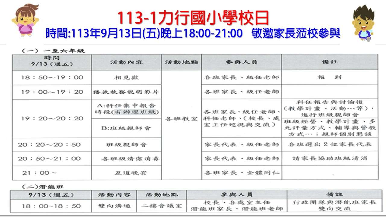 113-1力行國小學校日-- 時間:113年9月13日(五)晚上18:00-21:00...敬邀家長蒞校參與!!