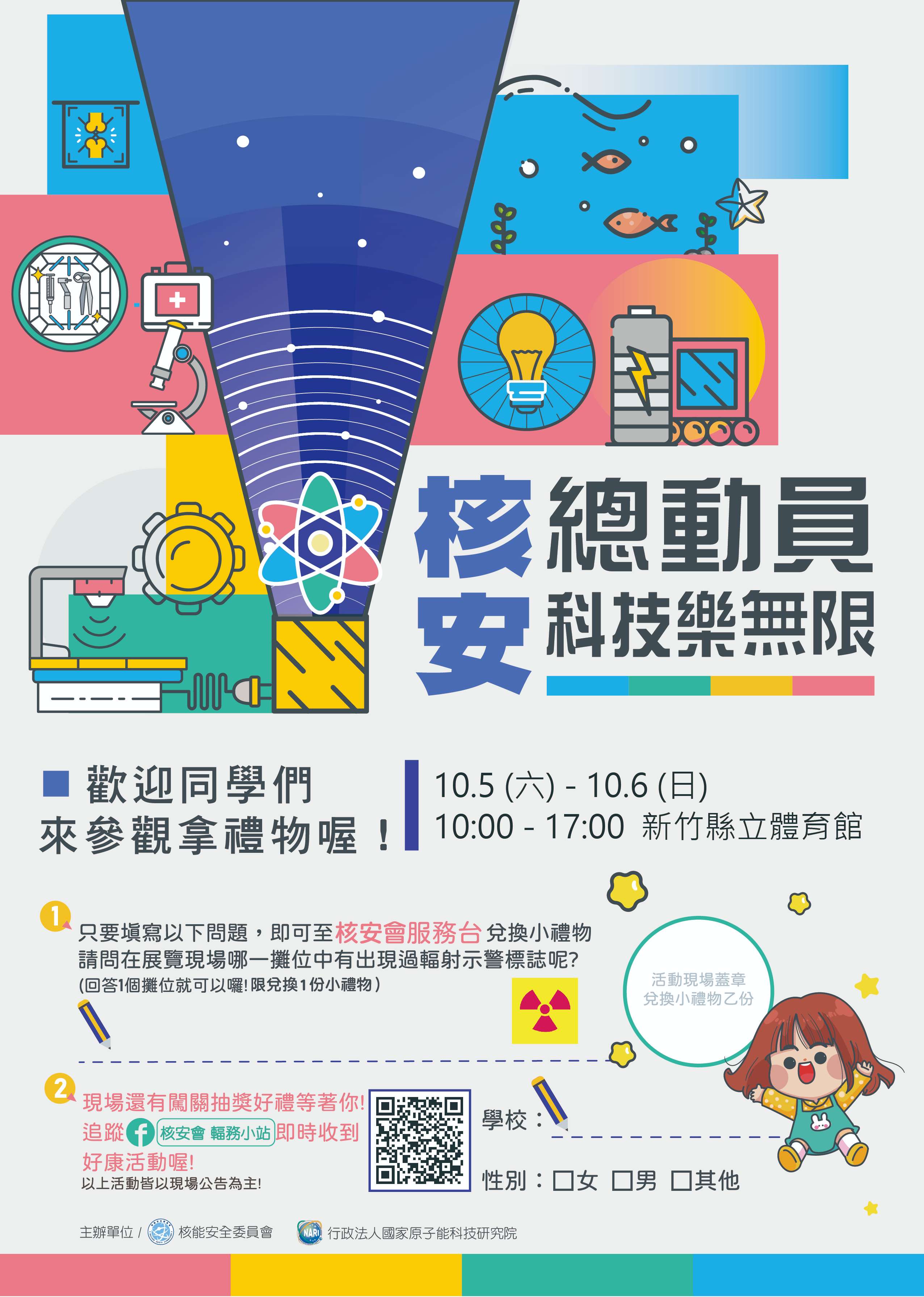 說明: 一、依據113年9月23日臺教國署國字第1130111213號函辦理。 二、旨揭科普展將透過闖關遊戲,以趣味性方式介紹「輻射在 生活中的應用與防護、如何檢測海洋中的氚、核電廠怎麼 除役、什麼是核廢料」等內容,現場亦有摸彩活動,請貴 校(含國立學校)鼓勵學生踴躍參加。