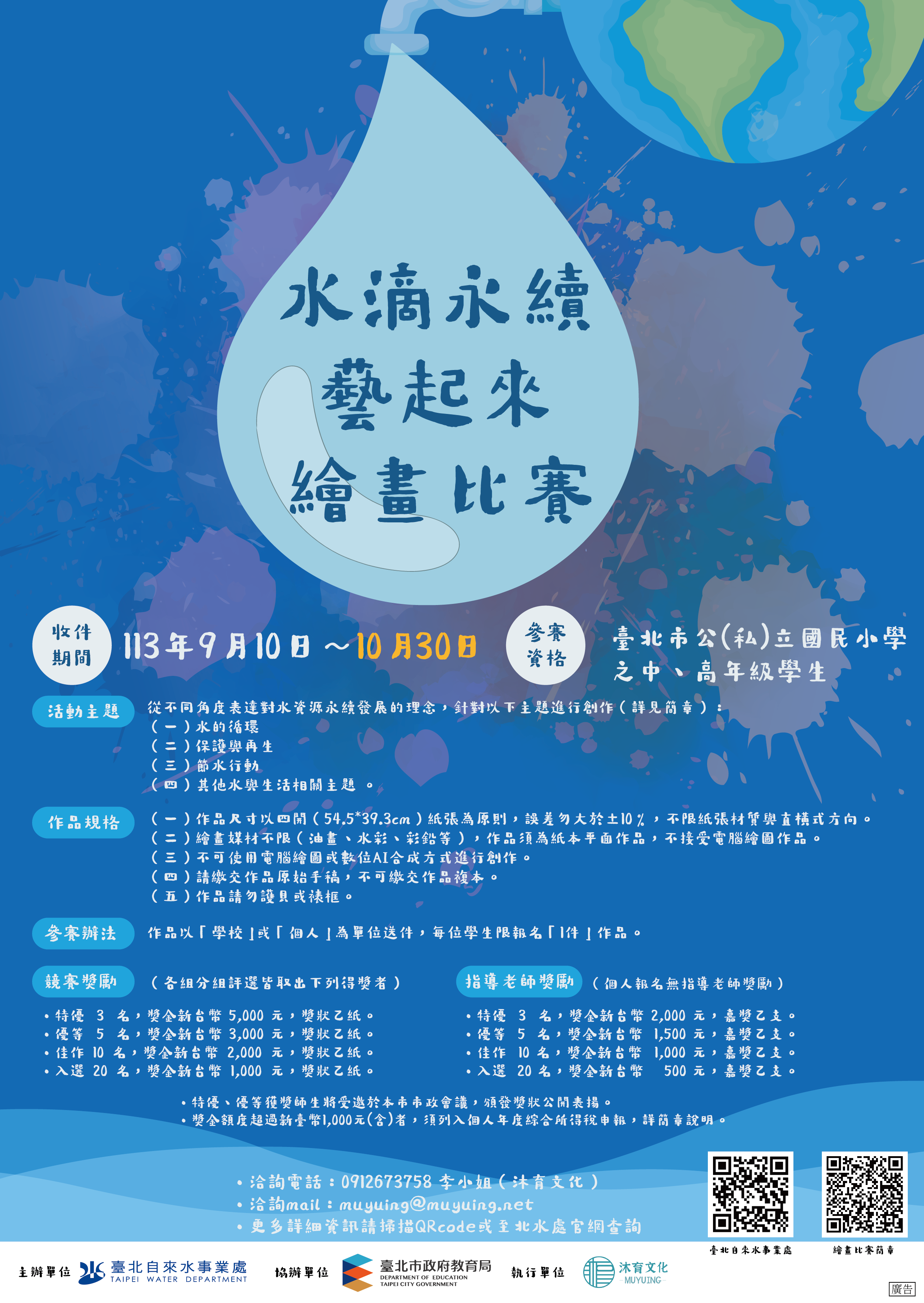 說明: 一、本處113年9月26日北市水企字第1136023627號函諒達。 二、為因應山陀兒颱風影響作業時程,及提升節水教育推廣成 效吸引更多學童參賽,原「繪畫比賽」比賽報名期限自113 年10月16日延至113年10月30日,並開放學童以個人參賽方 式報名。敬請轉知參賽師生,並於貴校電子佈告欄及網站 協助宣傳。 三、檢送113年「水滴永續藝起來」繪畫比賽簡章(修正版)及 海報各1份(如附件)。