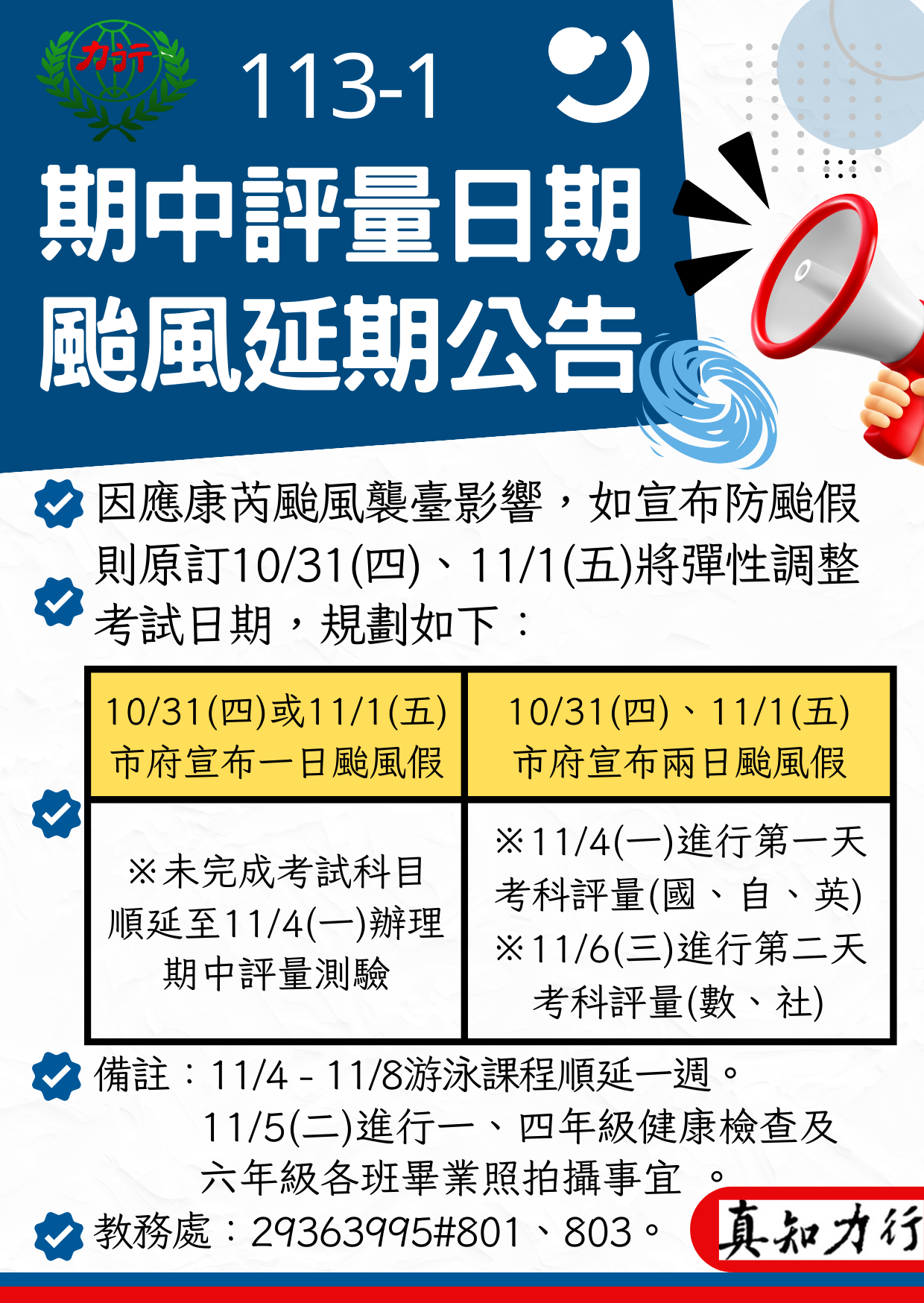 113-1學期期中評量如遇颱風放假因應調整考試日期如附件 若未遇颱風放假,則依預訂期程正常考試。