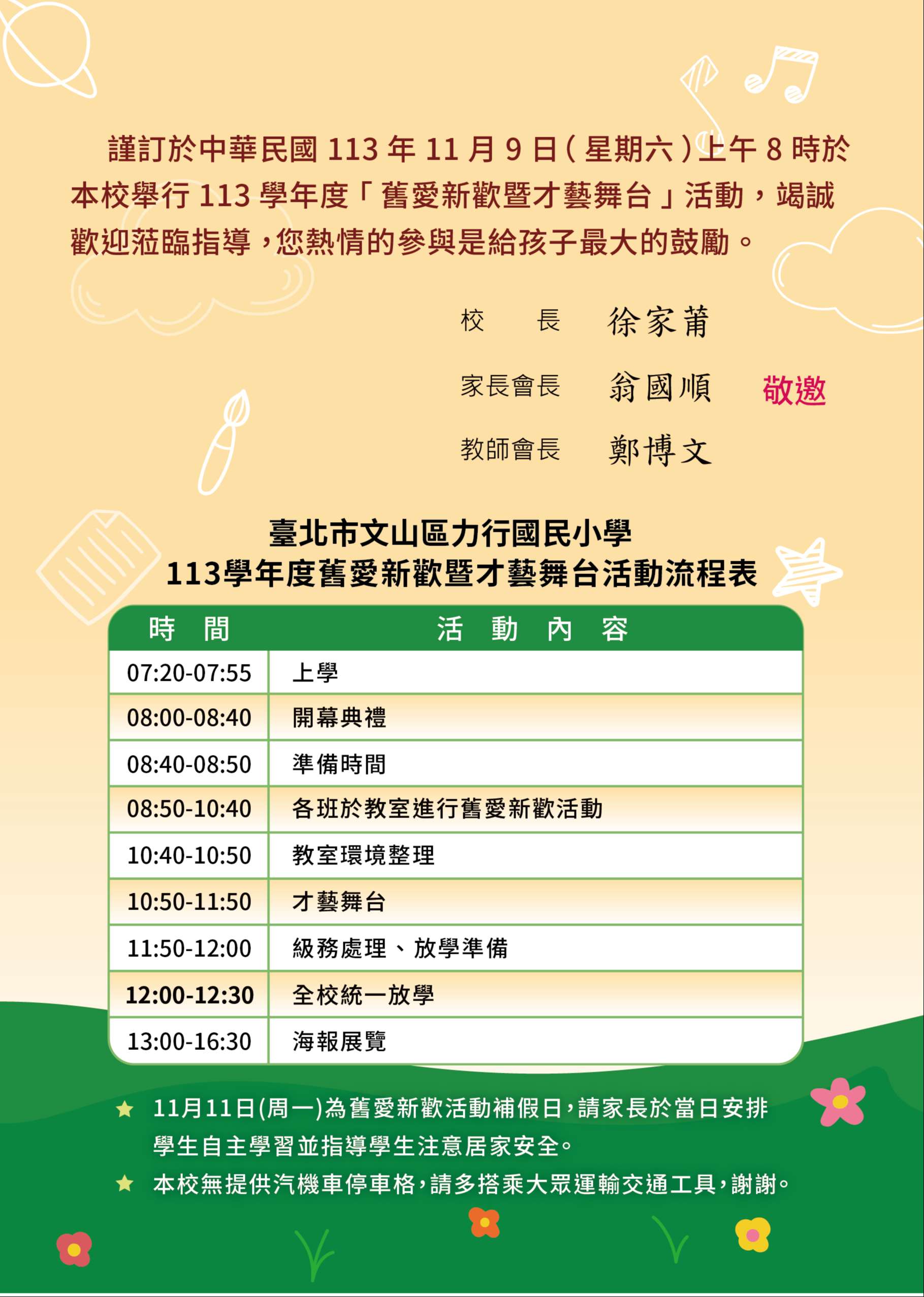 11月9日(六)為本校舊愛新歡暨才藝舞台活動日,11/11(一)補假一日。