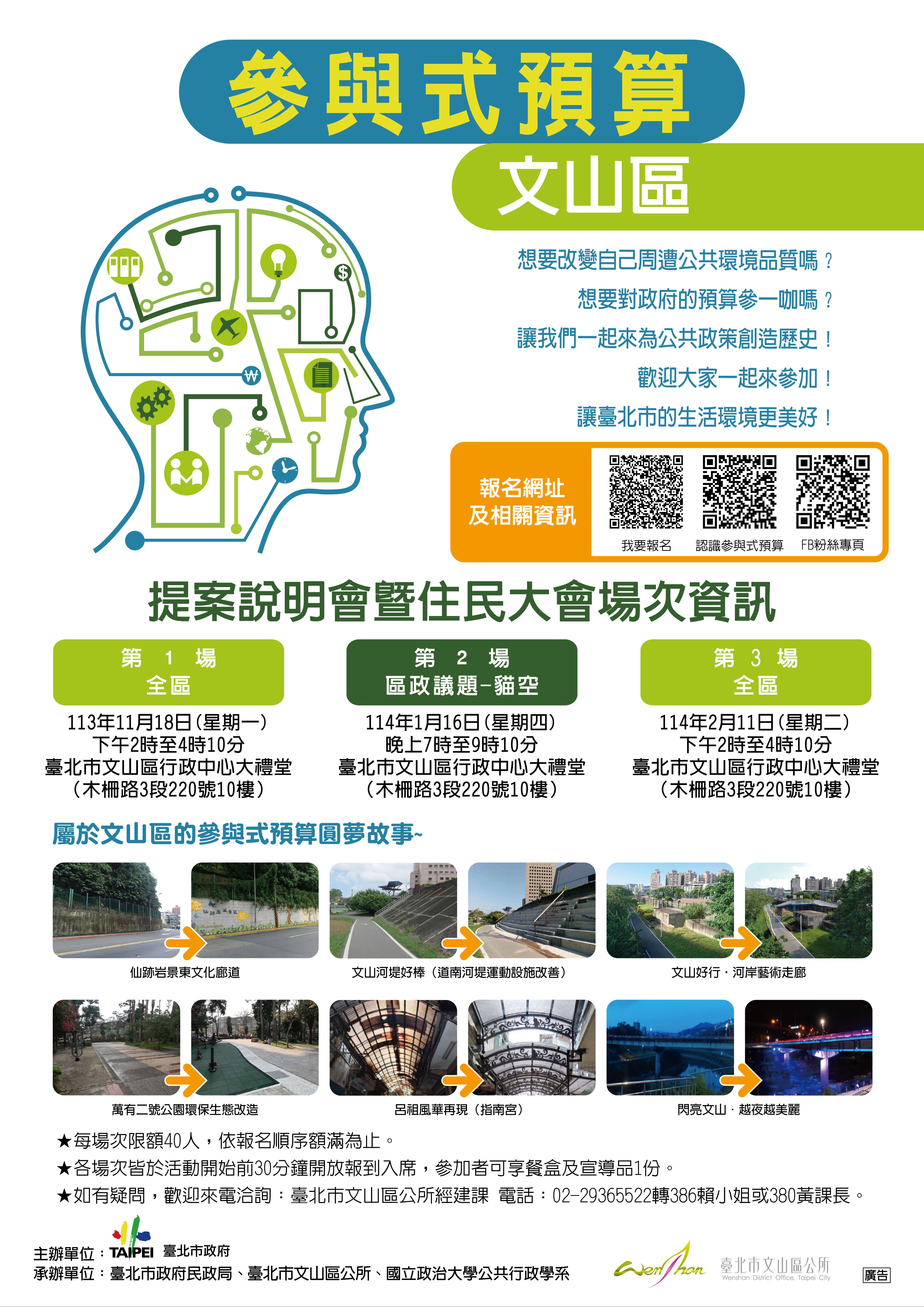 四、隨文檢附宣傳海報電子檔1份,請惠予協助刊登,相關資訊請參閱臺北市政府公民提案參與式預算資訊平台(網址:https://pb.taipei/),歡迎大家踴躍報名參加,讓文山區的生活環境更美好!