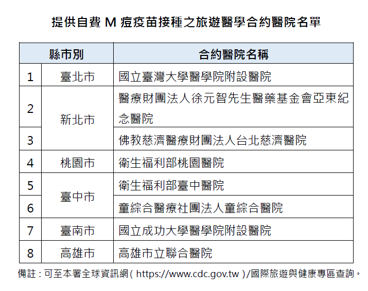 主旨:轉知衛生福利部疾病管制署自113年12月1日起,於全國8家旅遊醫學合約醫院提供M痘(Mpox)疫苗自費接種服務一案。
