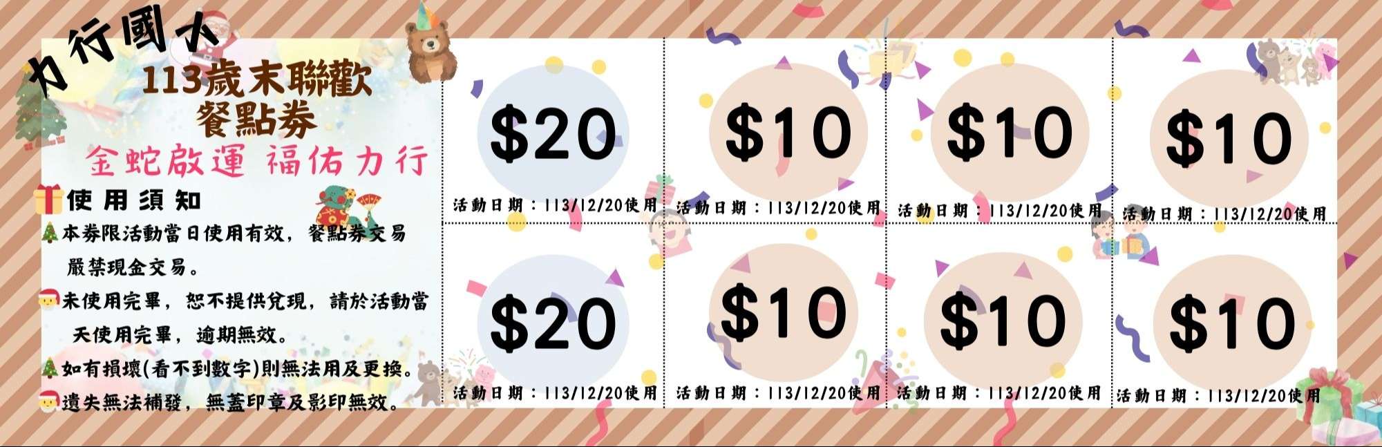 113學年度歲末聯歡晚會即將於12月20日(五)晚上6:30展開,活動當天晚會攤商販售只收取餐點券,為避免活動當天等待購買餐點劵人潮衆多,12/12(四)起至12/19(四)於家長會辦公辦理預購喔!