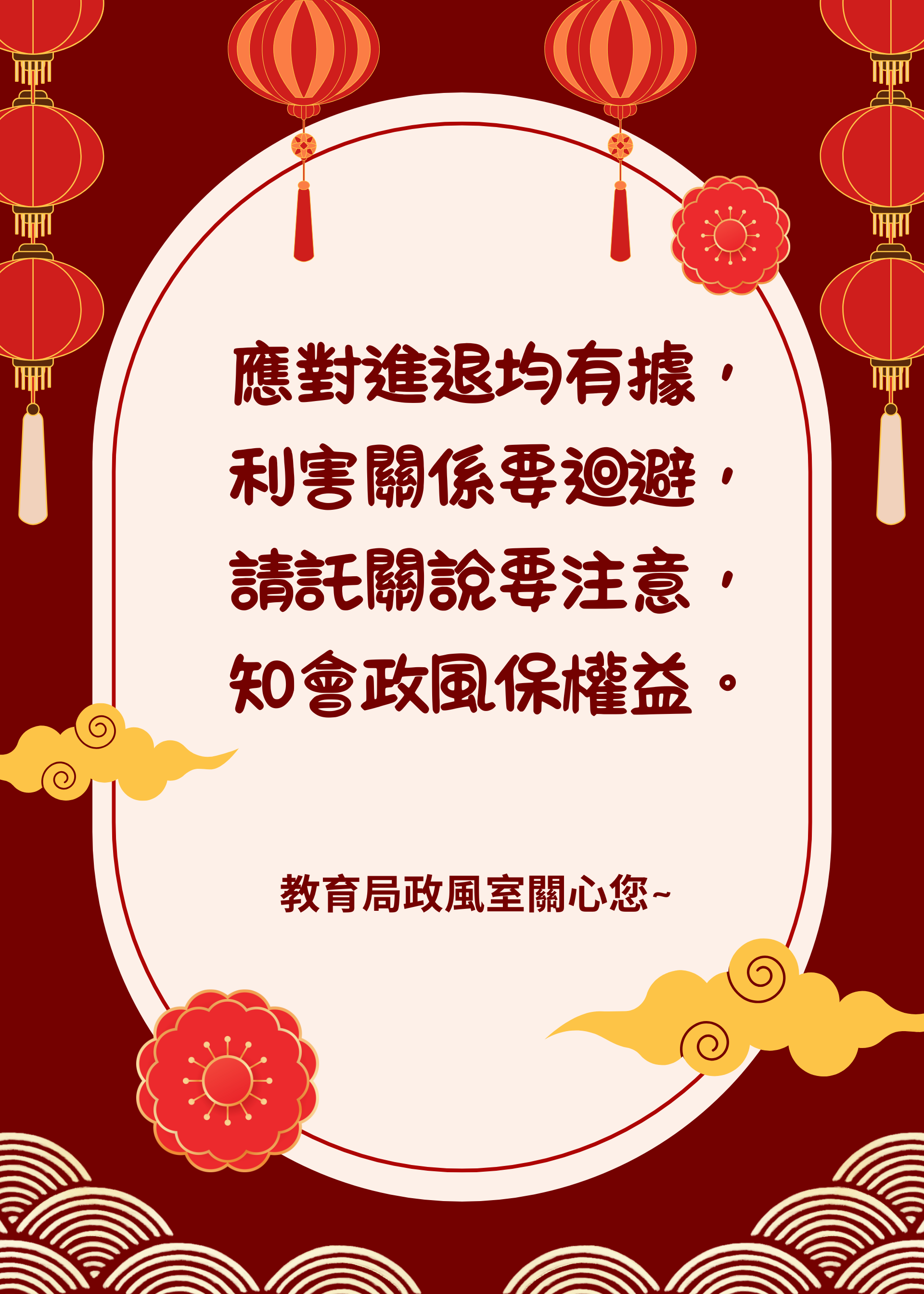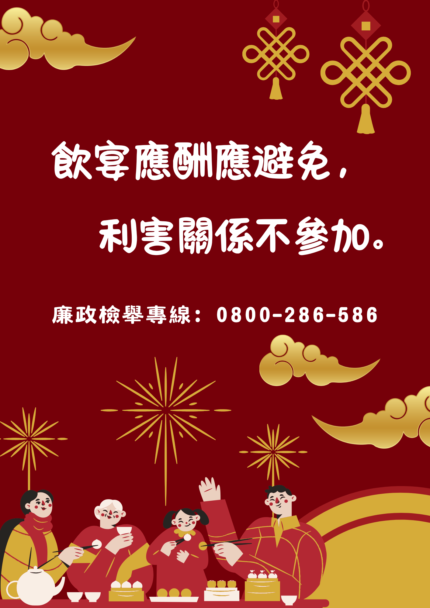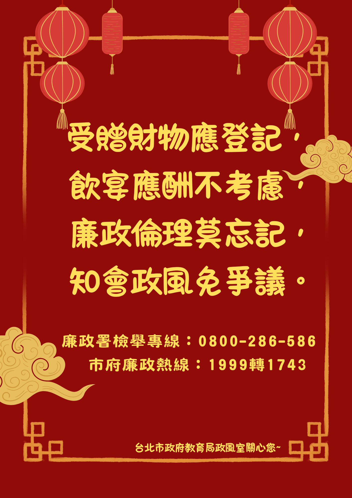 春節將屆,餽贈、邀宴行為較為頻繁,請長官同仁恪遵「臺北市政府公務員廉政倫理規範」規定,對與職務有利害關係者之受贈財物、飲宴應酬、請託關說及其他廉政倫理事件,應依規定確實報備登錄,並避免酒駕、出入不正當場所之違法違紀行為。