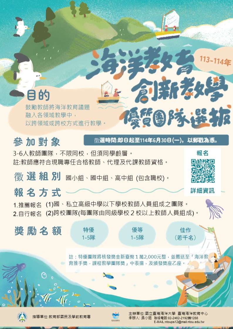 二、為培育具備海洋素養的人才,並推動海洋相關政策,教育 部自108年起辦理旨揭選拔活動,鼓勵高級中學以下學校教 師將海洋相關議題融入課程中,透過多元化教學方式在課 堂上呈現,協助學生建立海洋知識,增進對海洋議題的理 解與關注,進而提升其海洋素養,為我國未來永續發展奠 定基礎。