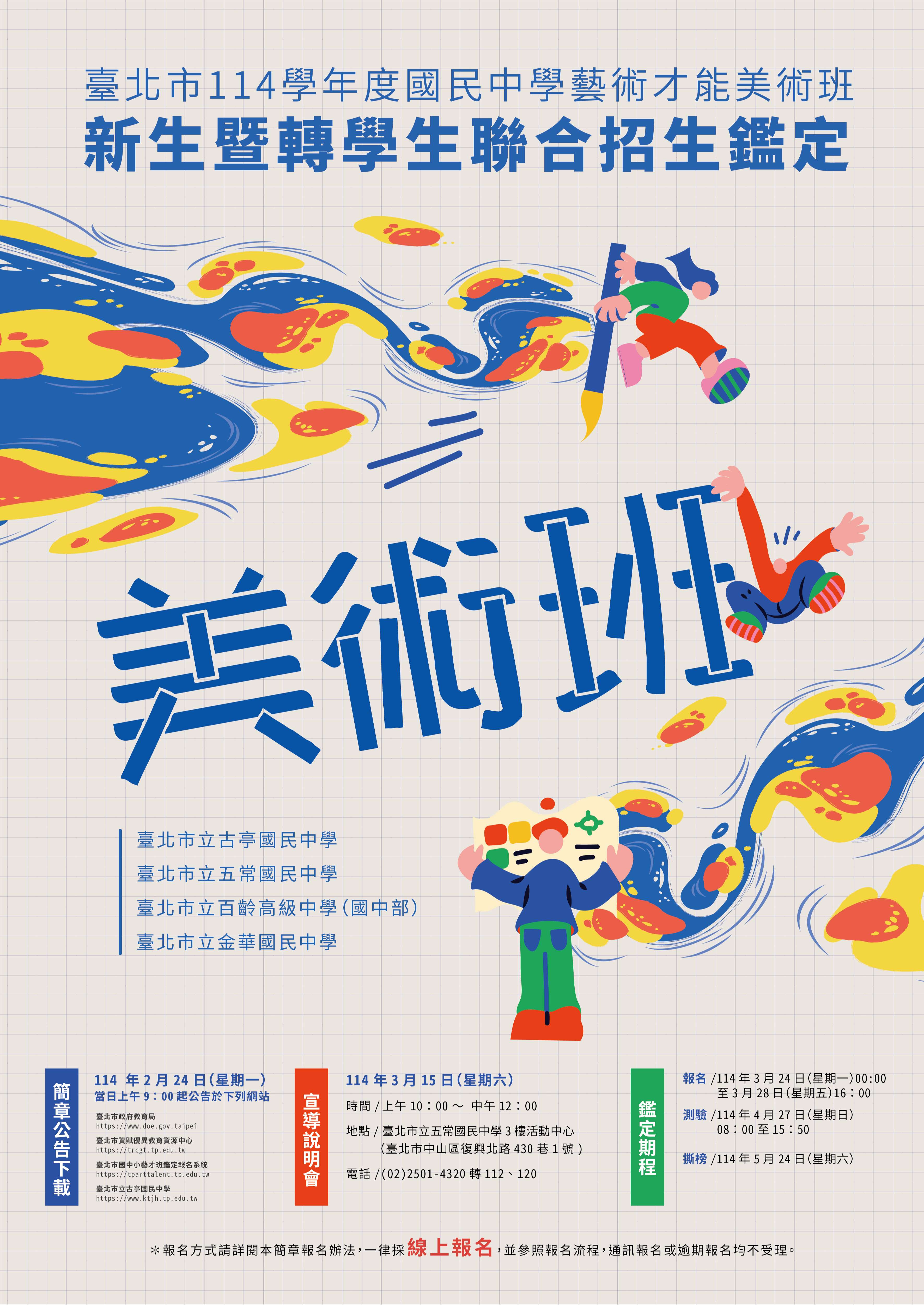 公告轉達臺北市114學年度國民中學藝術才能美術班新生暨轉學生聯合招生鑑定海報電子檔資訊.鼓勵符合資格或意願學生參閱報名.