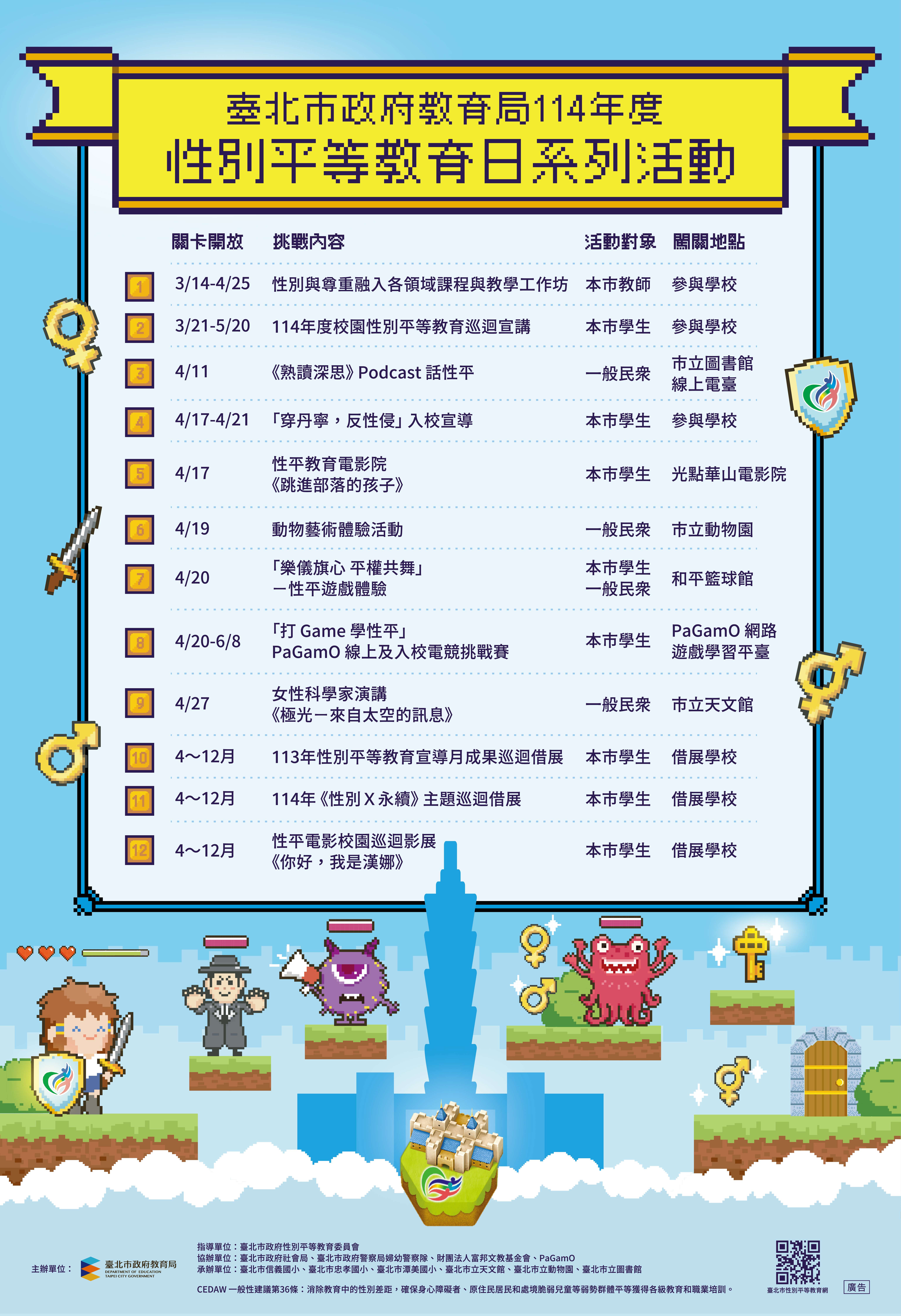 公告轉達本市114年度性別平等教育日海報資訊,學校協助公布於電子布告欄及校網,並響應辦理宣導課程活動及鼓勵親師生參與,目前開放申請報名之活動請參閱: