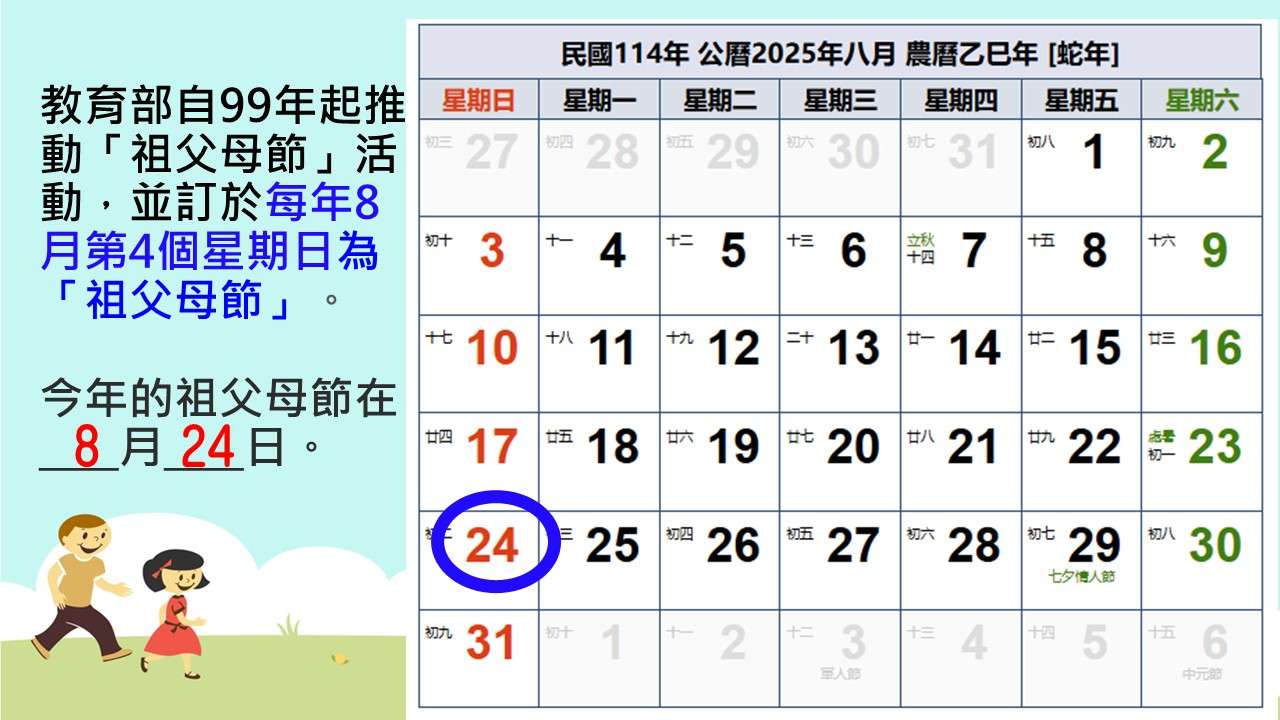 教育部自99年起推動「祖父母節」活動,並訂於每年8月第4個星期日為「祖父母節」。今年的祖父母節在8月24日(日)。