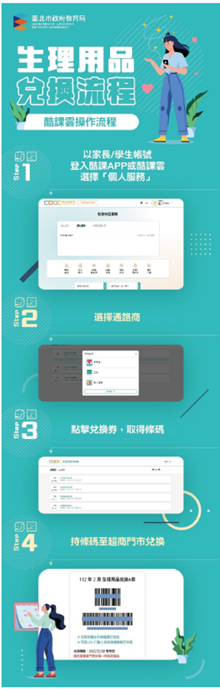臺北市政府教育局「國中小女性生理用品補助計畫」說明:兌換券2張,將於每月1日發放,兌換效期:2個月內月換完畢。