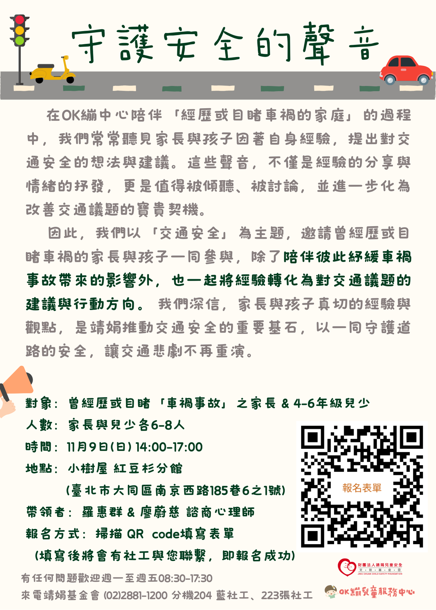 靖娟基金會OK繃兒童服務中心將於114年11月9日14時至17 時辦理以「交通安全」為主題之團體活動,邀請曾經歷或 目睹車禍之家長及兒少共同參與,期協助家長及兒少紓緩 事故影響之餘,也能凝聚意見並討論交通環境的改善方 向。 三、活動報名及相關資訊,請洽詢靖娟基金會OK繃兒童服務中 心。