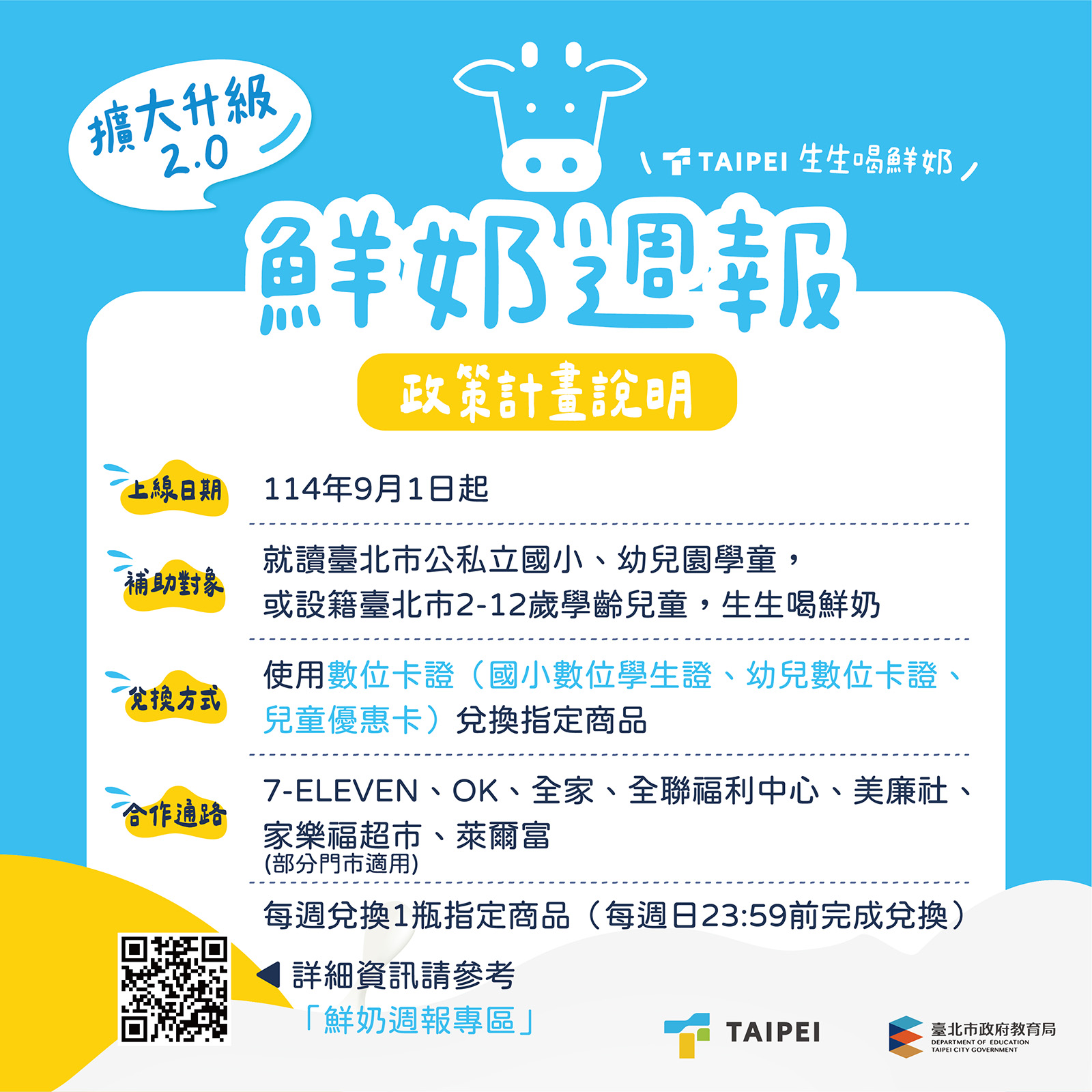 臺北市推動「鮮奶週報—生生喝鮮奶」,辦理期程自114年9月1日起實施至 115年7月31日,全年無休補助,不分平假日、寒暑假每週提供 1 瓶乳品。讓2至12歲學齡學童透過固定兌換鮮奶或豆漿,養成規律補充營養的好習慣,為了深化食農教育及營養觀念,特別推出「食在營養三重奏」活動,活動期間記得每週兌換,除了喝進健康外,還能享受三重驚喜喔! 🐄 ~ 力行國小 關心您 ~ 🐄