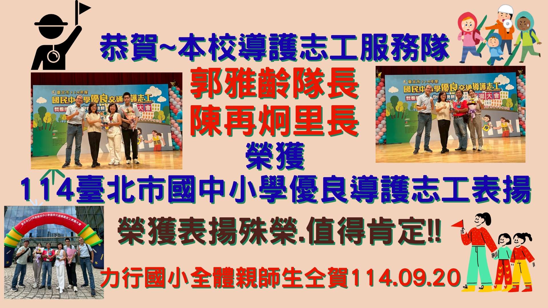 恭賀本校導護志工服務隊~郭雅齡隊長、陳再炯里長榮獲114年度臺北市國民中小優良導護志工表揚獎勵殊榮,9/20(五)上午於中油大樓接受公開表揚,感謝🙏校長、會長代表學校共同致贈花束💐、感恩祝福,共同感謝🙏優良導護志工,分享獲獎喜悅,也肯定所有志工夥伴們的熱情❤️志工服務和辛勞付出👍!3 Q!