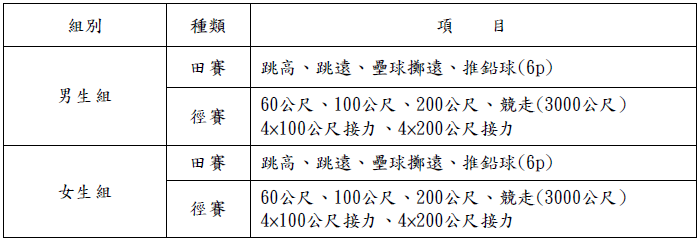2、田徑:114年11月11日(星期二)、11月12日(星期三),地點為臺北田徑場。