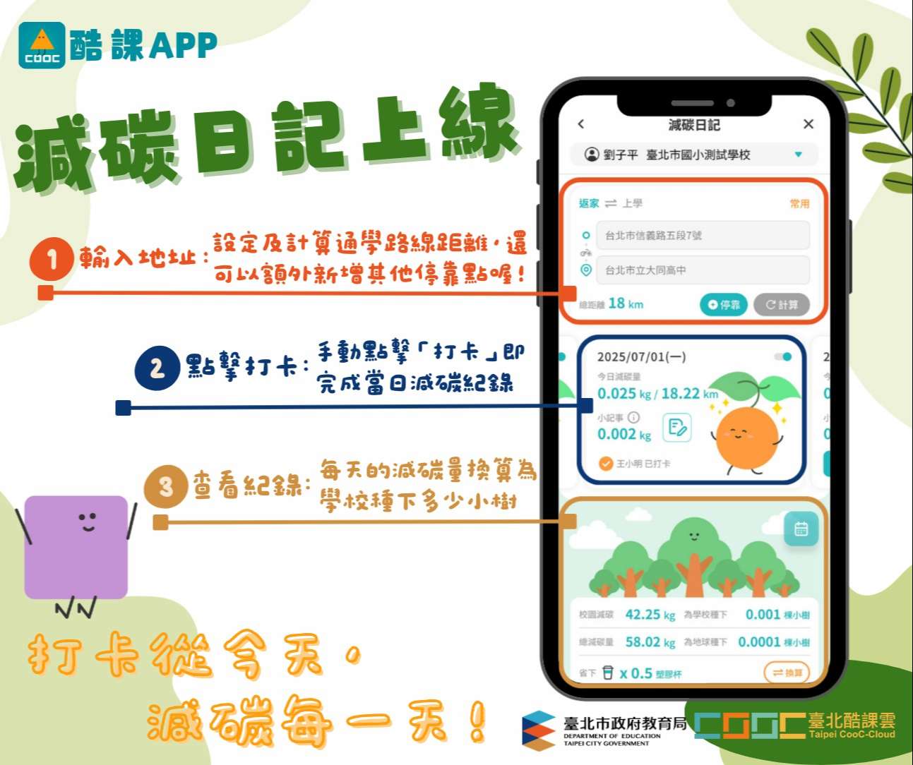 二、因應「減碳日記(酷課APP功能模組)」開發完成,修正國 小低碳上學計畫,主要修正內容摘要如下: (一)鼓勵學生或家長使用酷課APP「減碳日記」,透過每日打 卡記錄減碳情形。 (二)彙整及填報:採雙軌並行,如班上學生部分使用紙本、 部分使用減碳日記,僅需彙整填報紙本數據。酷課APP 「減碳日記」所得減碳資訊,將由教育局彙整。各校承 辦人可從「減碳日記」查詢學校減碳情形。 (三)由本局彙整各校數位及紙本減碳量總和。