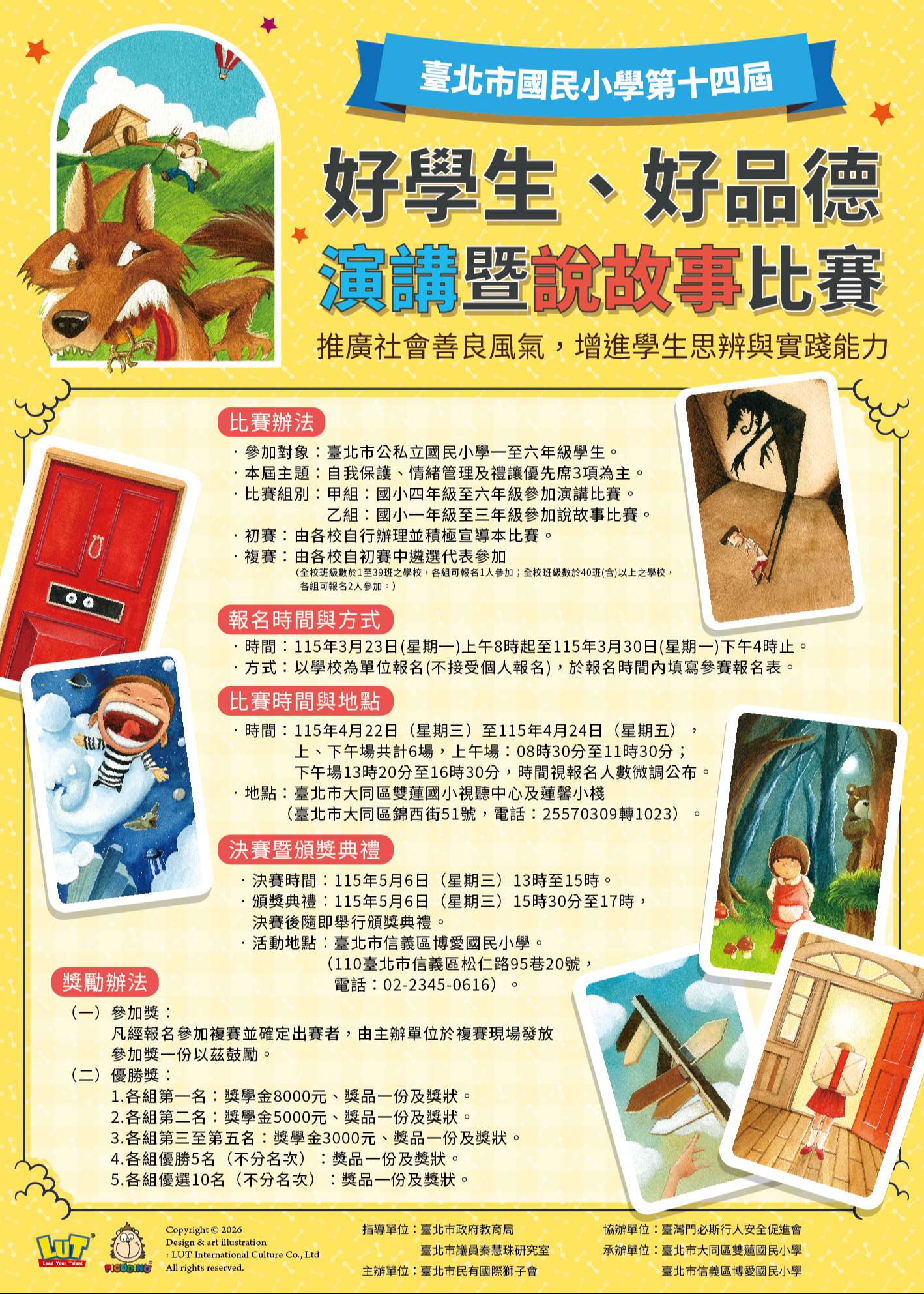 6、正式比賽時間:115年4月22日(星期三)至115年4月 24日(星期五),上、下午場共計6場。報名者將安排於其中1場參賽,名單於115年4月10日(星期五)前公 告於雙蓮國小網頁。比賽地點為臺北市大同區雙蓮國 小(臺北市大同區錦西街51號)。