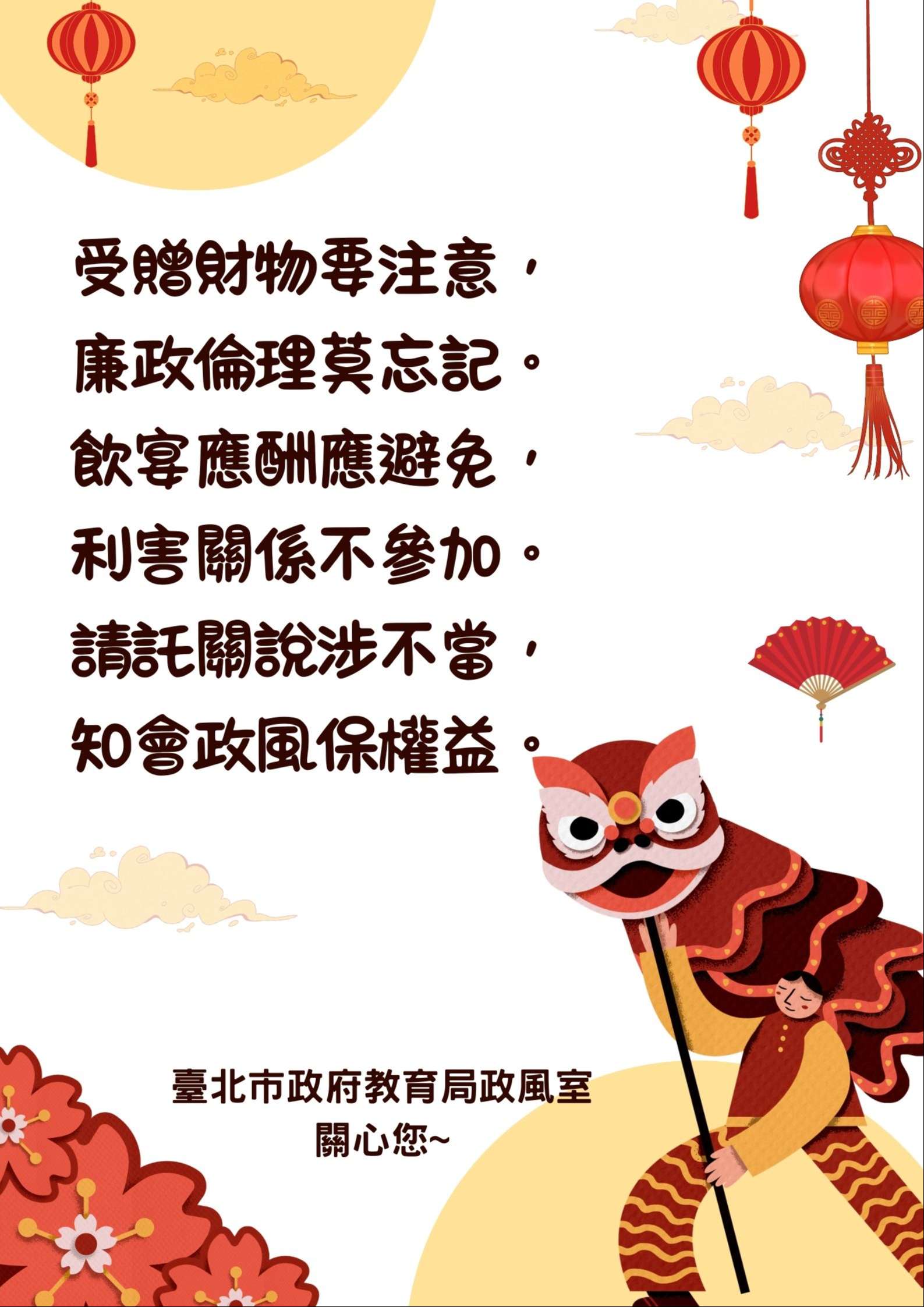 春節將屆,餽贈、邀宴行為較為頻繁,請長官同仁恪遵「臺北市政府公務員廉政倫理規範」規定,對與職務有利害關係者之受贈財物、飲宴應酬、請託關說及其他廉政倫理事件,應依規定確實報備登錄,並避免酒駕、出入不正當場所之違法違紀行為。