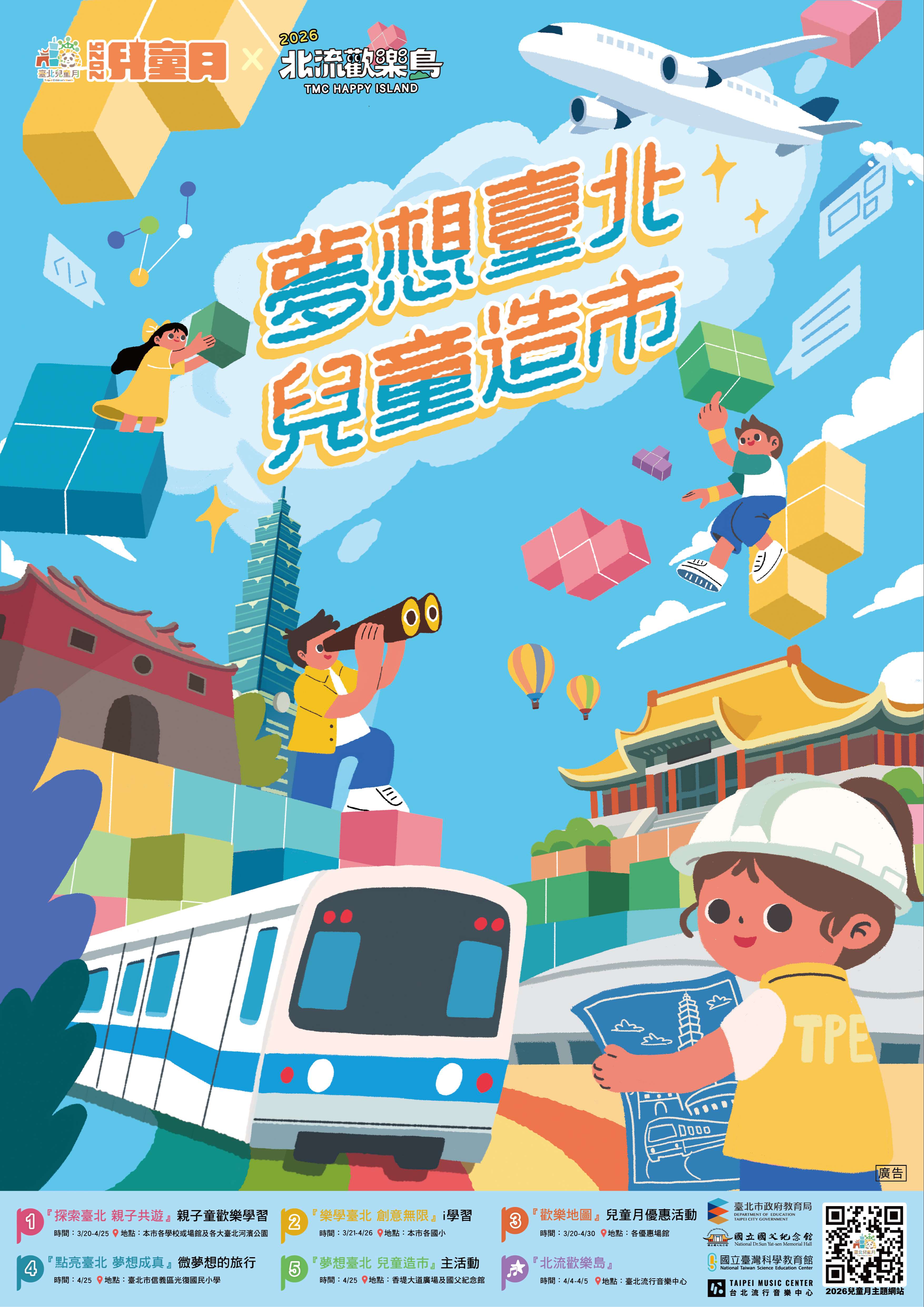 一年一度的兒童月到來!今年2026兒童月主題為「夢想臺北 兒童造市」,教育局已整合全市豐富的慶祝活動與場域優惠資訊,誠摯邀請各位家長們踴躍參與,與孩子一同規劃專屬的四月探索旅程!🔗 活動網站請點擊: https://act.tp.edu.tw(各項「假日樂學」活動可透過 臺北酷課雲 APP 進行報名)讓我們一起陪伴孩子,在四月綻放最燦爛的笑容!