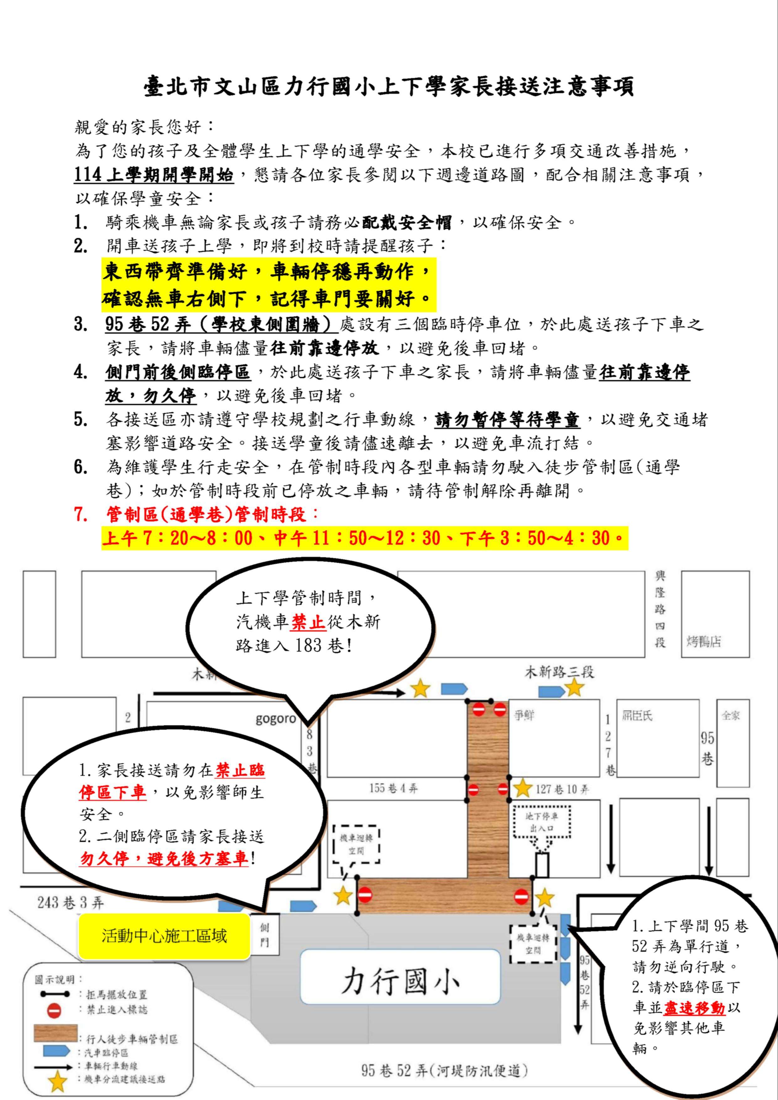 參閱力行國小上下學家長交通接送注意事項,再請家長與社區好夥伴們,共同配合協助。