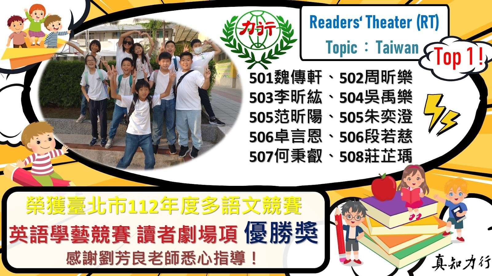 英語讀者劇場-501魏傳軒、502周昕樂、503李昕紘、504吳禹樂、505范昕陽、505朱奕澄、506卓言恩、506段若慈、507何秉叡、508莊芷瑀榮獲優勝,感謝劉芳良老師指導。