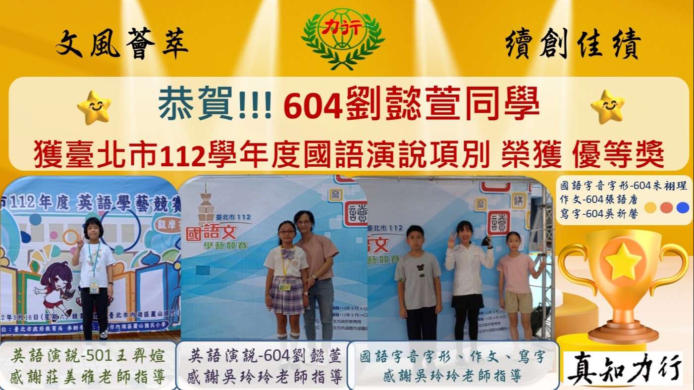 國語演說-604劉懿萱榮獲優等,感謝吳玲玲老師指導。